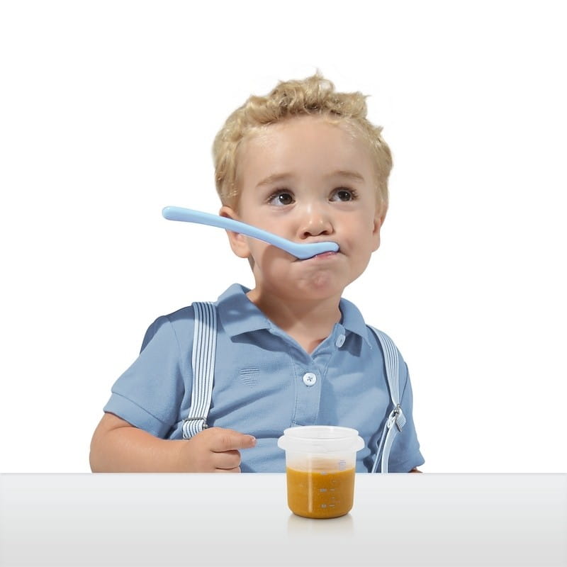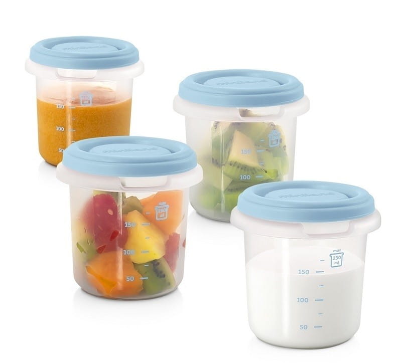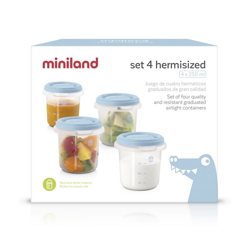 Jedzenie w pojemniku Miniland może być podgrzewane w mikrofali, zamrażane, a pojemnik wyparzany, sterylizowany, myty w zmywarce (za wyjątkiem pokrywki). Miarka pozwoli odmierzyć pożądaną ilość pokarmu.