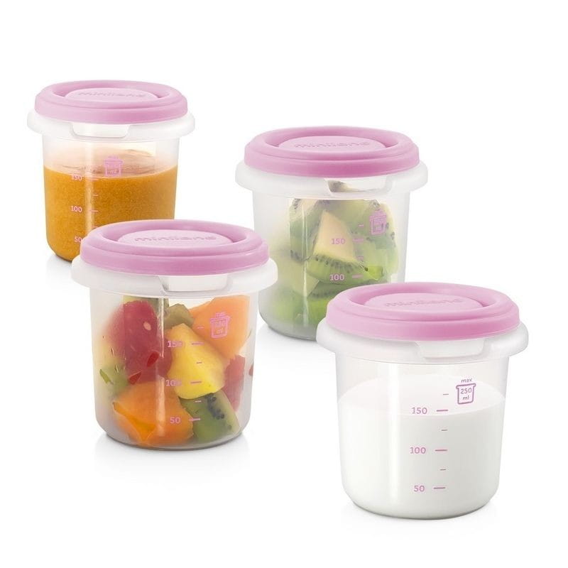 Jedzenie w pojemniku Miniland może być podgrzewane w mikrofali, zamrażane, a pojemnik wyparzany, sterylizowany, myty w zmywarce (za wyjątkiem pokrywki). Miarka pozwoli odmierzyć pożądaną ilość pokarmu.