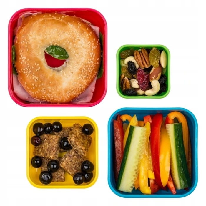 Pojemniki do przechowywania jedzenia: przekąsek, kanapek to komplet 4 kompaktowych pudełek z kotkami. Śniadaniówki mają 4 wielkości, są wkładane jedna w drugą zatem zajmują mało miejsca podczas przechowywania.