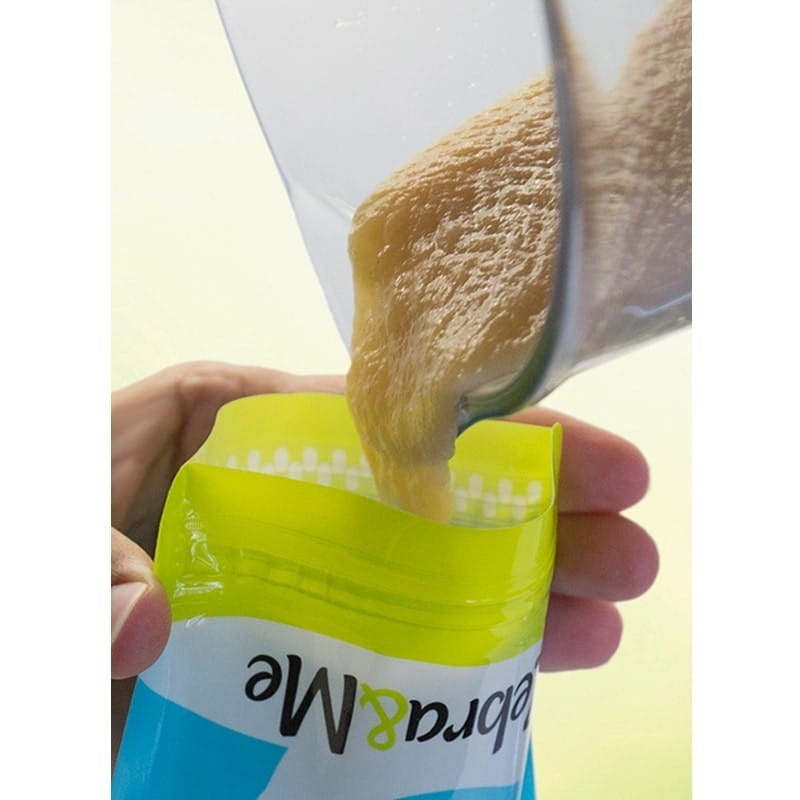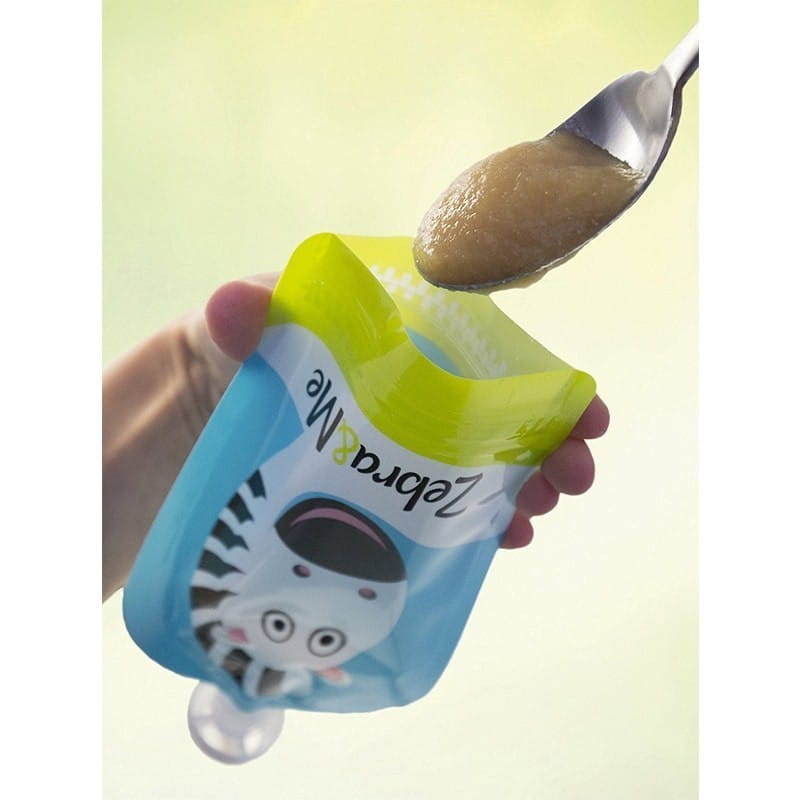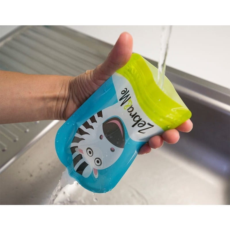 Saszetki wielorazowe Zebra & Me do wielokrotnego napełniania musem owocowym, zupką, jogurtem, rozdrobnionym daniem, kremem warzywnym, umożliwiają zabranie własnego, wartościowego jedzenia wszędzie ze sobą. Wielorazowe tubki mają podwójne zamknięcie chroniące przed przeciekaniem. Otwór dolny jest szeroki więc łatwo napełnić tubki pokarmem, umyć po jedzeniu, brak ostrych krawędzi wewnątrz zapewnia higieniczność i pewność, że resztki jedzenia nie zostaną w rogach. Opatentowany kształt tubki pasuje do dziecięcych rączek i umożliwia samodzielne jedzenie. Kolorowe torebki na przekąski są wykonane z bezpiecznego materiału, mogą być zamrażane i podgrzewane do temp. 40 st. Tubka jest poręczna, zajmuje mało miejsca, zmieści się w dziecięcym plecaczku, zapewni wartościową przekąskę w podróży, na wycieczce, na spacerze, na plaży.
