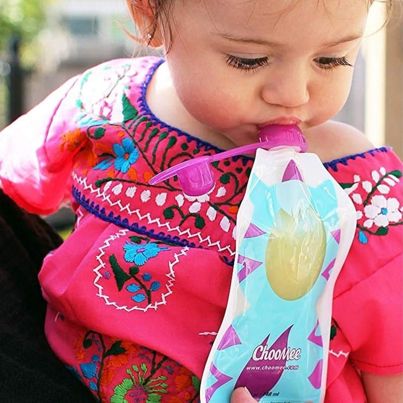 Saszetki wielorazowe SnakPack Fresh Squad firmy ChooMee do wielokrotnego napełniania musem owocowym, zupką, jogurtem, rozdrobnionym daniem, kremem warzywnym, umożliwiają zabranie własnego, wartościowego jedzenia wszędzie ze sobą. Wielorazowe tubki mają podwójne zamknięcie chroniące przed przeciekaniem. Otwór dolny jest szeroki więc łatwo napełnić tubki pokarmem, umyć po jedzeniu, brak ostrych krawędzi wewnątrz zapewnia higieniczność i pewność, że resztki jedzenia nie zostaną w rogach. Opatentowany kształt tubki pasuje do dziecięcych rączek i umożliwia samodzielne jedzenie. Kolorowe torebki na przekąski są wykonane z bezpiecznego materiału, mogą być zamrażane i podgrzewane do temp. 50 st. Tubka jest poręczna, zajmuje mało miejsca, zmieści się w dziecięcym plecaczku, zapewni wartościową przekąskę w podróży, na wycieczce, na spacerze, na plaży.
