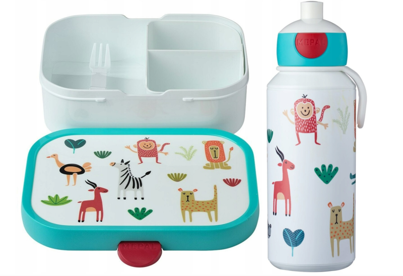 Zestaw lunchowy Mepal składa się ze szczelnego bidonu do picia oraz pudełka na lunch z wyjmowanym wkładem typu bento i widelcem. Lekki i wytrzymały zestaw Lunch set Campus jest rekomendowany do szkoły i przedszkola.