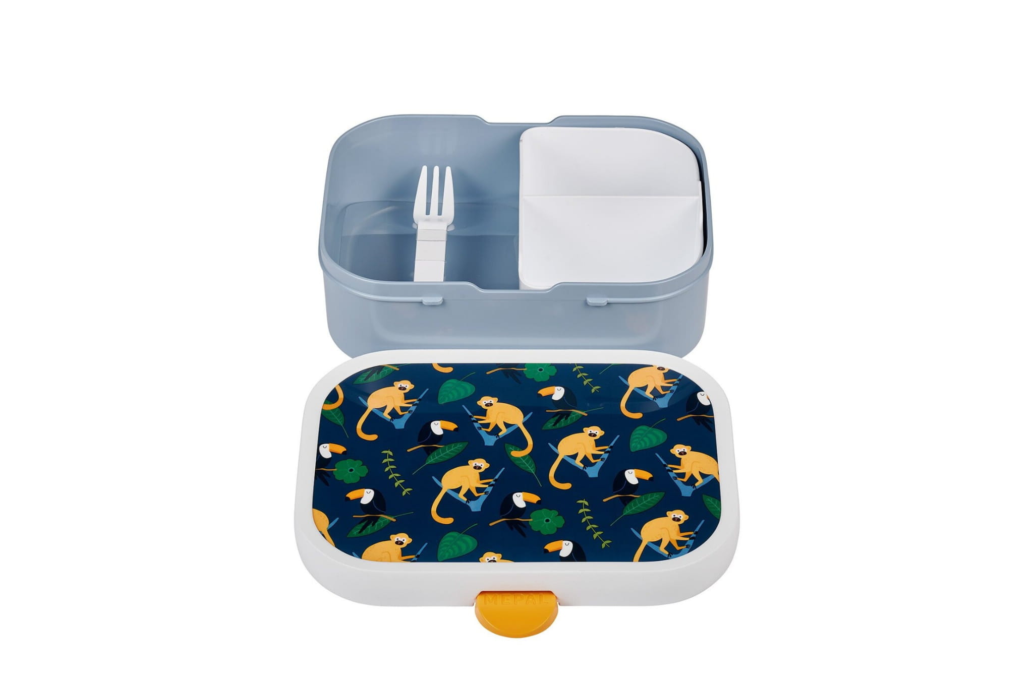 Zestaw lunchowy Mepal składa się ze szczelnego bidonu do picia oraz pudełka na lunch z wyjmowanym wkładem typu bento i widelcem. Lekki i wytrzymały zestaw Lunch set Campus jest rekomendowany do szkoły i przedszkola.