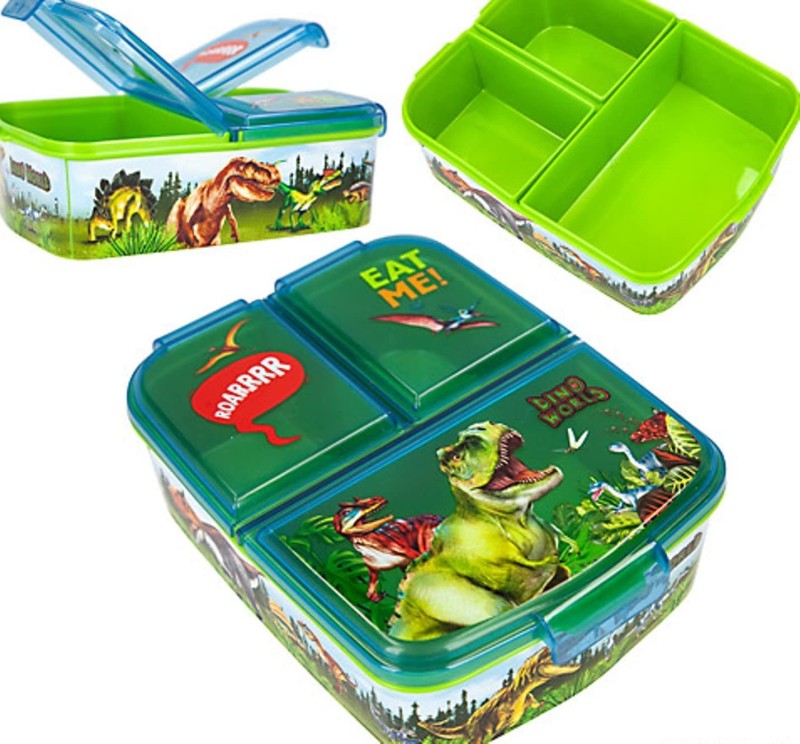 Pojemniki na jedzenie z przegródkami, zielona śniadaniówka Depesche w dinozaury. Lunchbox ma otwierane wieczka, osobno do każdej przegródki, co pozwoli wygodnie sięgnąć po przekąskę, kanapkę, czy owoce. Rozmiar idealnie pasuje do dziecięcego plecaka.
