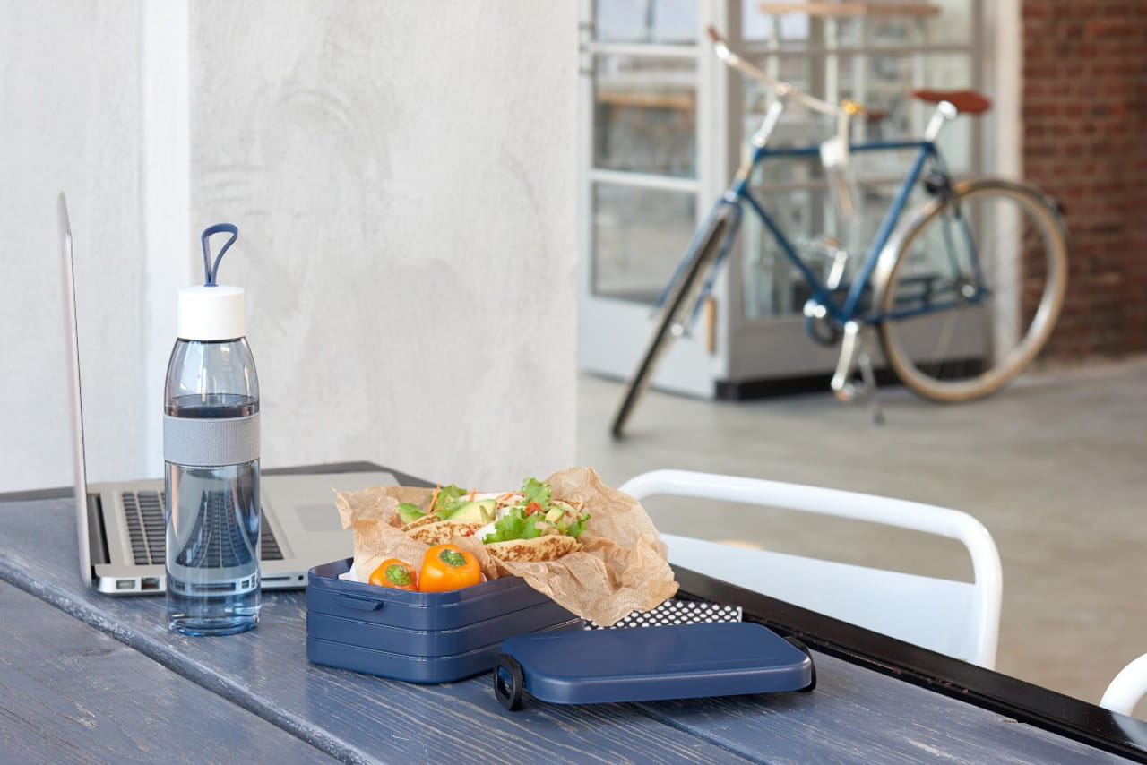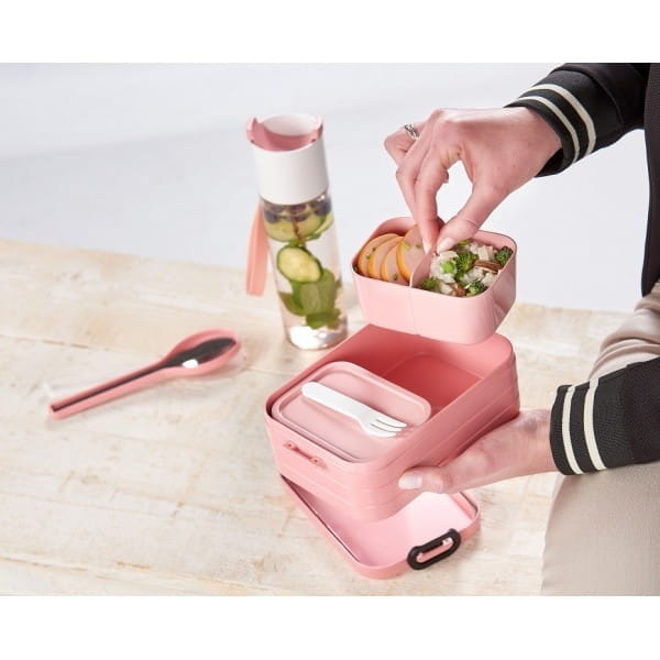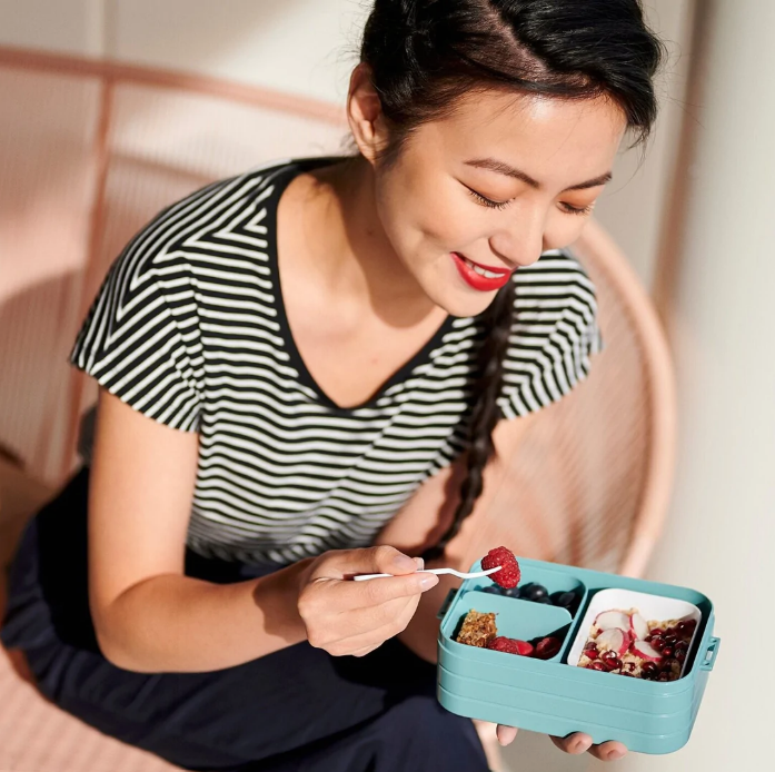 Lunchbox Take a Break Mepal z widelcem, pojemniczkiem z pokrywką i podwójnym pojemniczkiem (wyjmowanym) została wykonana przez holenderską firmę Mepal - specjalizującą się w akcesoriach do żywności. Pojemnik typu bento umożliwia zabranie na drugie śniadanie różnorodnego jedzenia: kanapki, owoce, warzywa, orzechy, przekąski, sosy, ciasto i wygodne jedzenie poza domem.