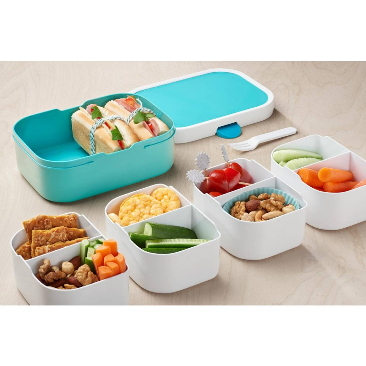Pojemnik na jedzenie z wyjmowanymi przegródkami jest zamykany na klips. Bardzo łatwy w obsłudze do otwierania i zamykania po posiłku. Rozmiar idealnie pasuje do torebki lub dziecięcego plecaka, do szkoły, przedszkola, na spacer, czy piknik.