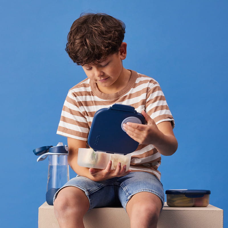 Nowy, mini lunchbox b.box ma wiele przemyślanych przegródek na jedzenie, jest szczelny, ma możliwość dostosowania do rodzaju jedzenia oraz uchwyt do wygodnego przenoszenia.