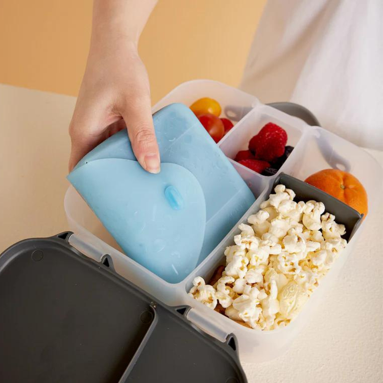 Prostokątna saszetka na kanapki jest idealna na bułkę lub inną, małą przekąskę. Silikon jest materiałem bezpiecznym i pozbawionym BPA. Dodatkowo kieszonka daje się bezproblemowo chłodzić w lodówce oraz zamrażać. Zabrudzone etui łatwo przemyć wodą i wysuszyć.