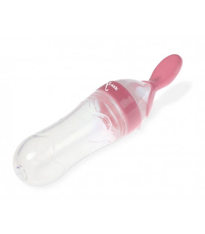 Pojemniczek jest odkręcany, łatwy w napełnieniu i wyczyszczeniu, mieści około 90 ml. Jedzenie dozuje się poprzez naciśnięcie na pojemniczek i odpowiednia porcja wypływa na łyżeczkę. Łyżeczka jest higienicznie zabezpieczona osłonką.