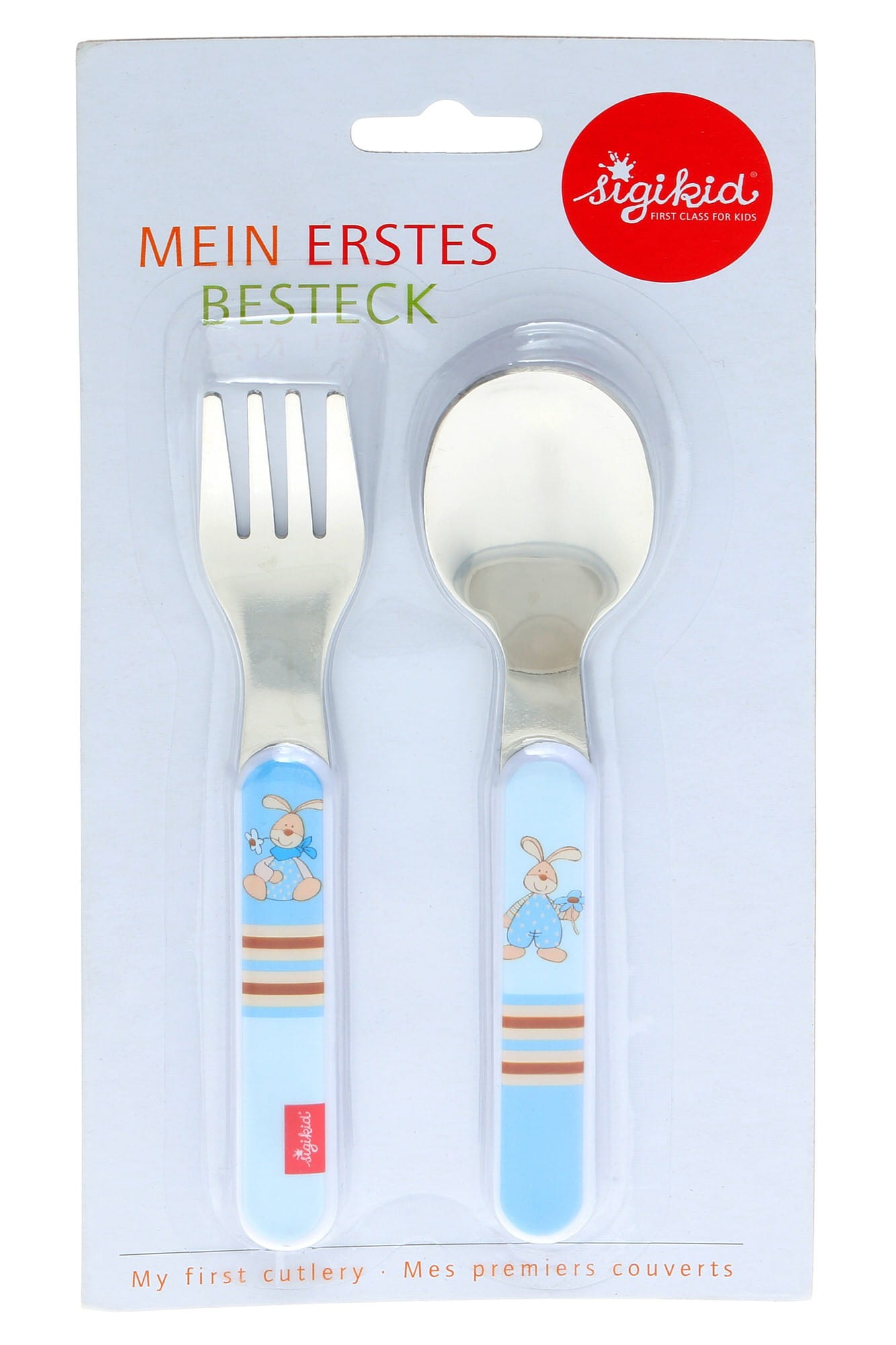 Moje pierwsze sztućce z królikiem Semmel Bunny Sigkid. Zestaw sztućców dla małych dzieci to widelec i łyżka. Metalowe sztućce są idealne dla dziecięcych rączek, odpowiedni rozmiar ułatwia samodzielne nabieranie i spożywanie posiłków. Delikatnie zaokrąglone ranty i uchwyty są bezpieczne i dostosowane do umiejętności motorycznych dzieci.