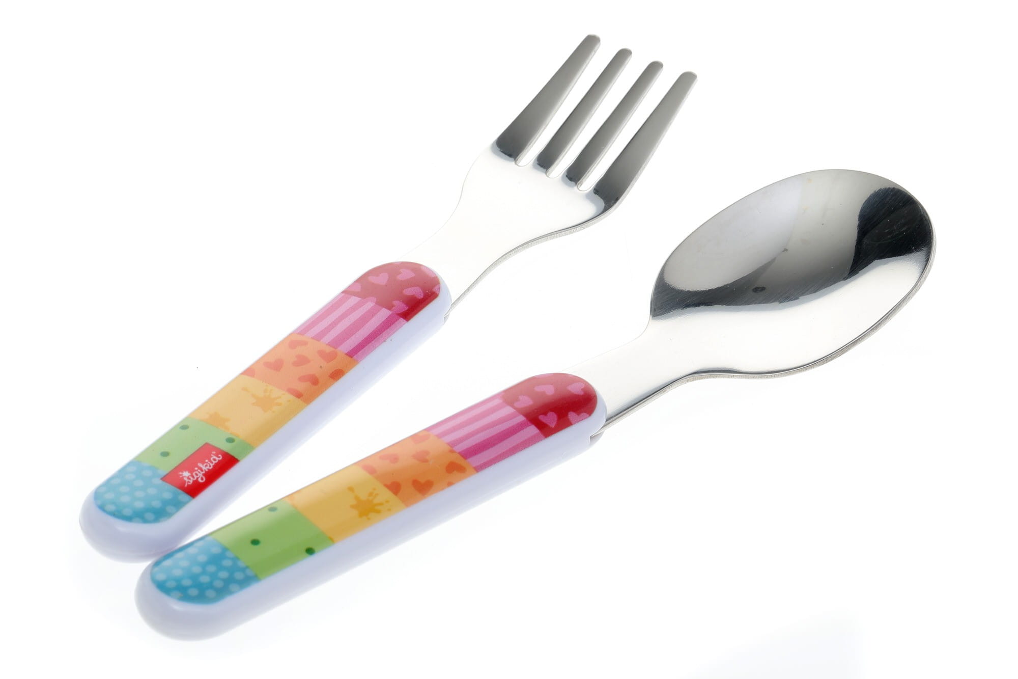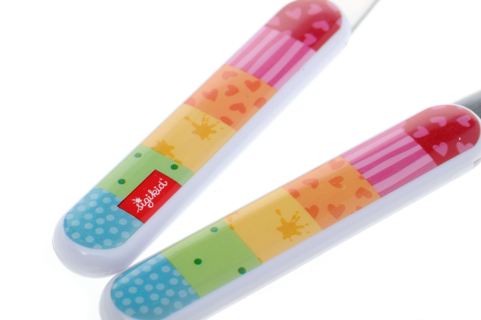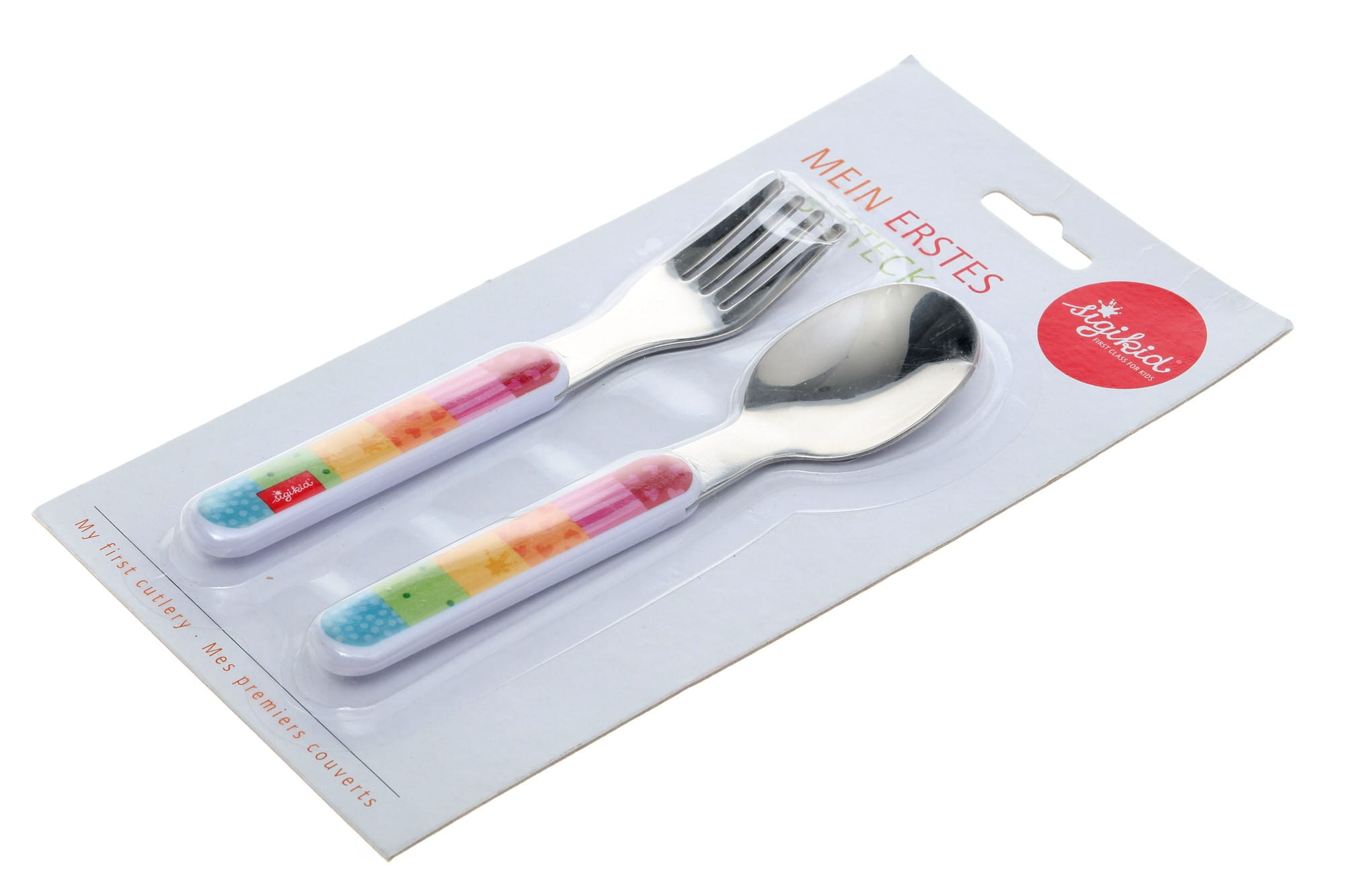 Moje pierwsze sztućce Rainbow Colours Sigkid. Zestaw sztućców dla małych dzieci to widelec i łyżka. Metalowe sztućce są idealne dla dziecięcych rączek, odpowiedni rozmiar ułatwia samodzielne nabieranie i spożywanie posiłków. Delikatnie zaokrąglone ranty i uchwyty są bezpieczne i dostosowane do umiejętności motorycznych dzieci.