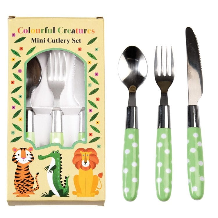 Moje pierwsze sztućce czyli komplet stalowych sztućców dla dzieci. Zestaw sztućców nóż, widelec i łyżka. Metalowe sztućce są idealne dla dziecięcych rączek, odpowiedni rozmiar ułatwia samodzielne nabieranie i spożywanie posiłków. Delikatnie zaokrąglone ranty i uchwyty są bezpieczne i dostosowane do umiejętności motorycznych dzieci.