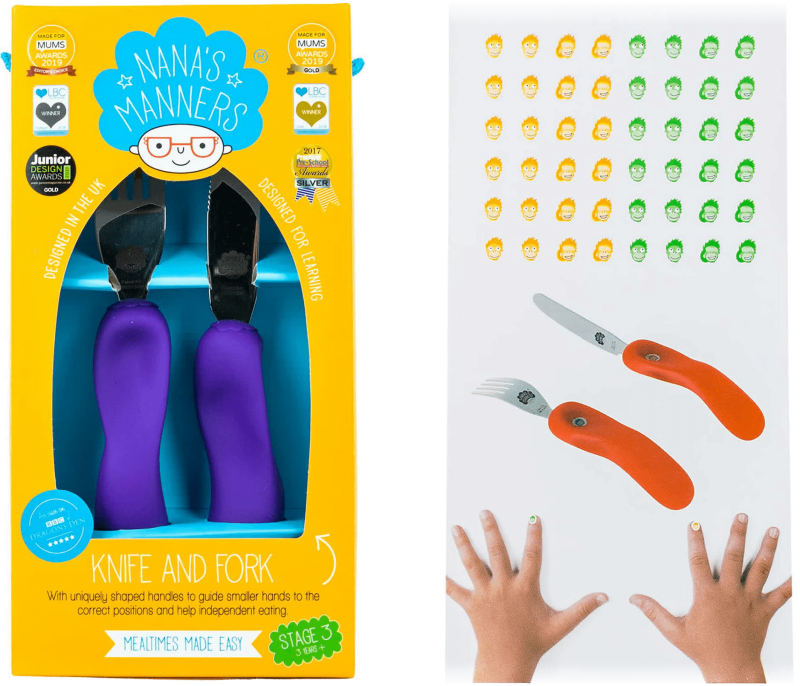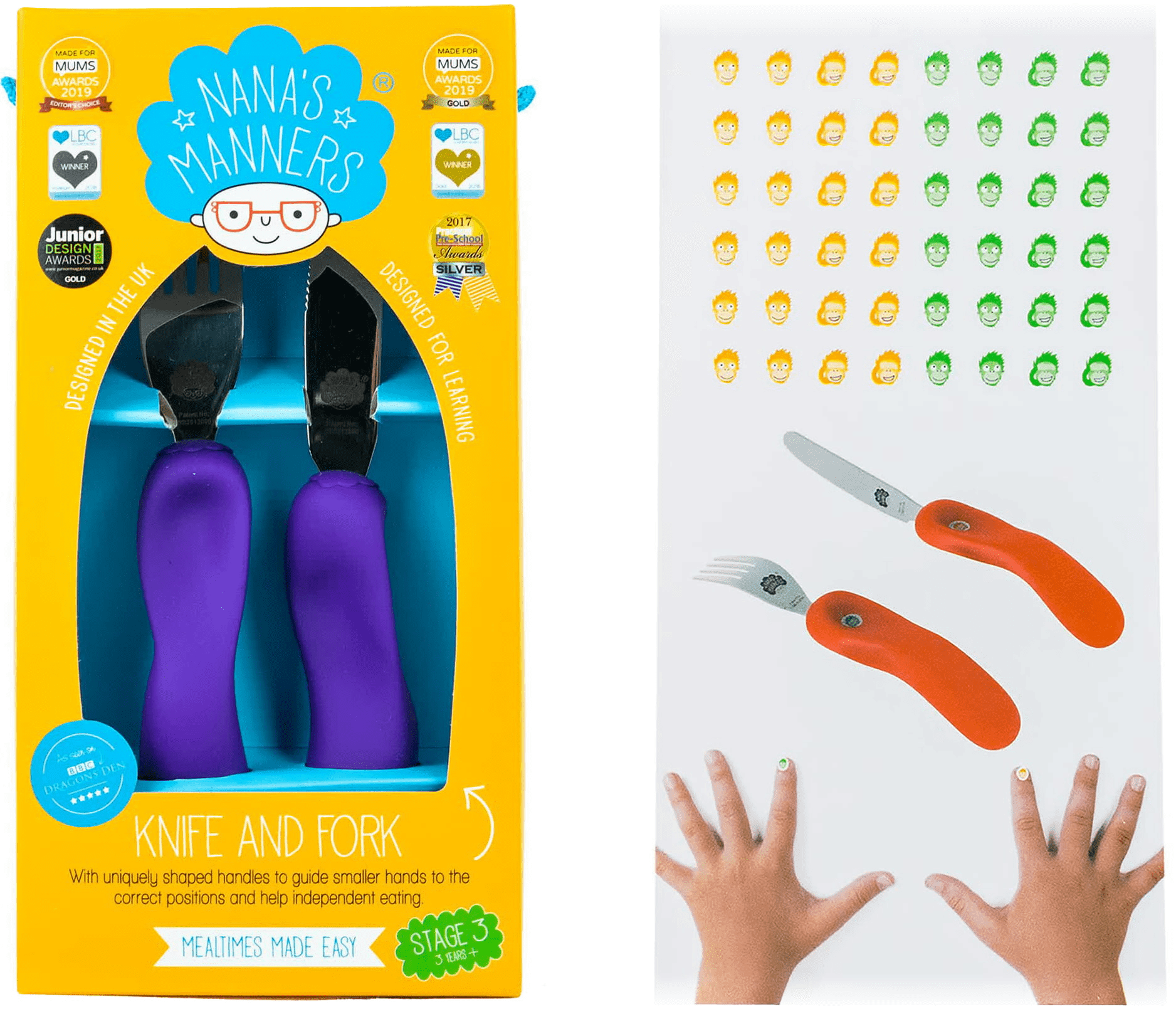 Zestaw sztućców Nana's Manners etap 3 dla dzieci w wieku przedszkolnym i szkolnym 3-9 lat w komplecie z naklejkami.