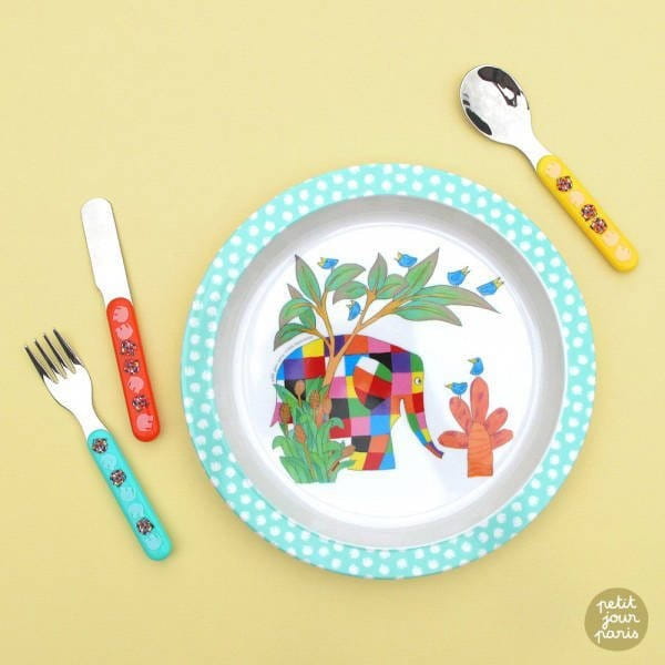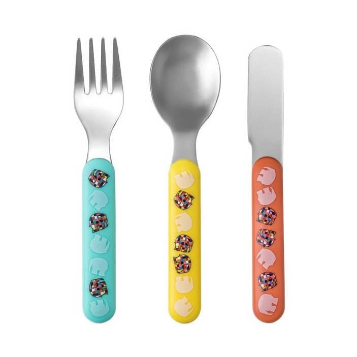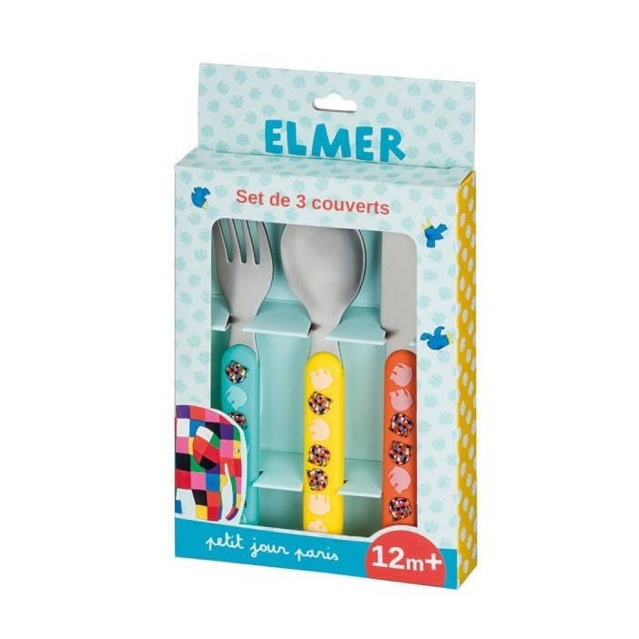 Moje pierwsze sztućce ze stali nierdzewnej Petit Jour Paris. Zestaw sztućców dla dzieci Słoń Elmer to nóż, widelec i łyżka. Metalowe sztućce są idealne dla dziecięcych rączek, odpowiedni rozmiar ułatwia samodzielne nabieranie i spożywanie posiłków. Delikatnie zaokrąglone ranty i uchwyty są bezpieczne i dostosowane do umiejętności motorycznych dzieci.