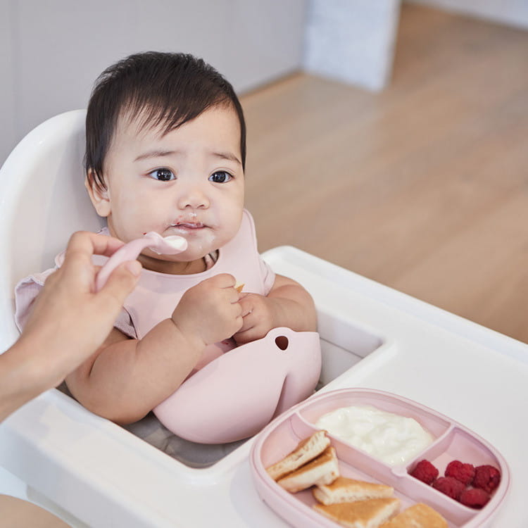 - Mniej bałaganu: Koniec z rozlanymi posiłkami na podłodze! Zakrzywione boki talerzyka ułatwiają nabieranie i samodzielne karmienie, tym samym chronią przed wypadaniem jedzenia.