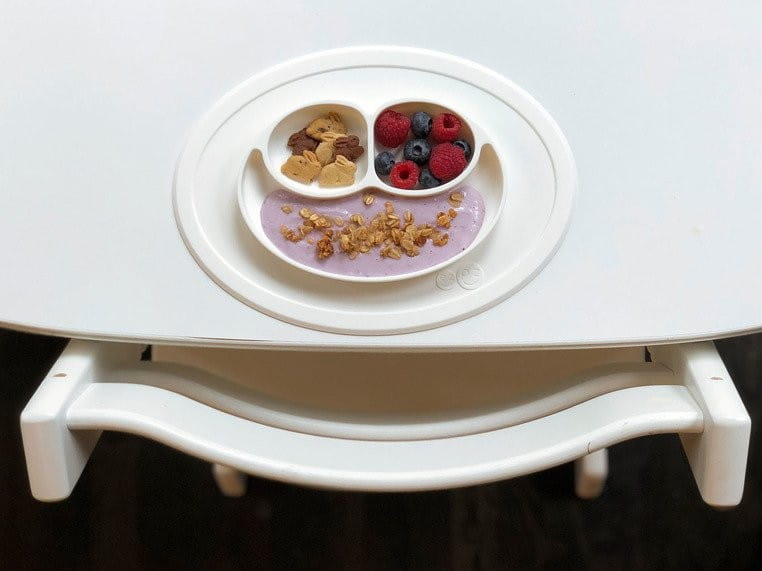 Mata do posiłków Happy Mat marki EZPZ to podkładka i trójdzielny głęboki talerzyk. Zaserwujemy na raz zdrowe, wartościowe, różnorodne posiłki. Przedziałki pozwolą nie łączyć pokarmów i konsystencji, czego małe dzieci często się domagają. Dzieci mogą dokonać wyboru co chciałby zjeść samodzielnie paluszkami próbować, doświadczać smaków i kolorów. Talerz przyssie się do blatu stolika, trudno będzie dziecku ją zrzucić na ziemię, a szerokie ranty maty osłonią przed bałaganem.