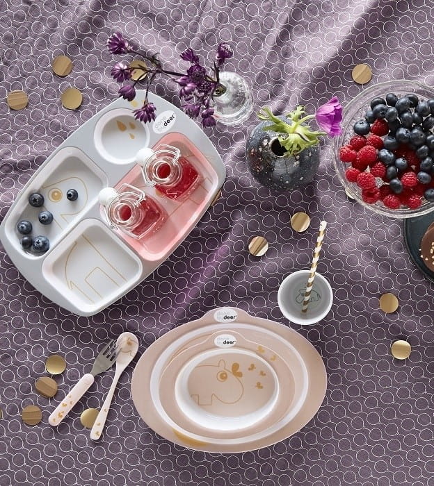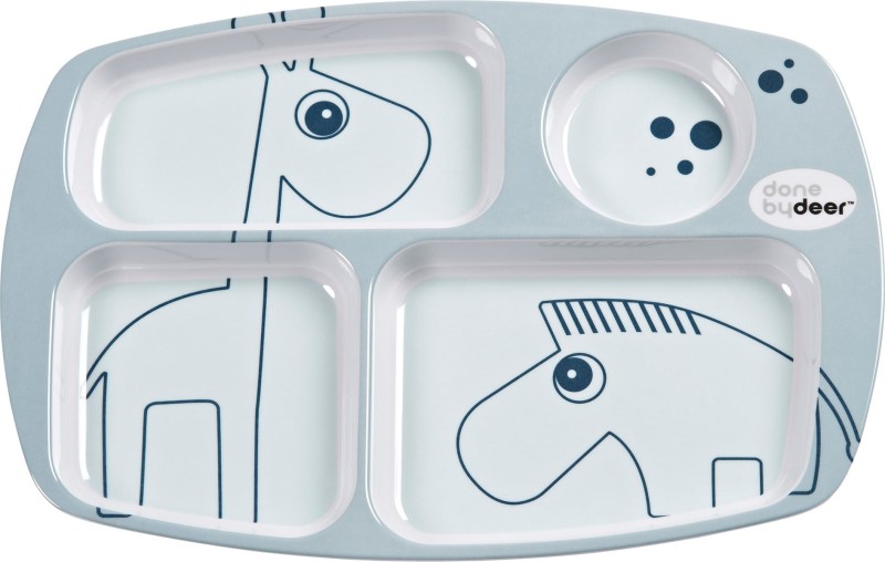 Talerz dzielony Done by Deer rozdziela posiłek na 4 porcje. Talerzyk dziecięcy delikatnie oddziela od siebie pokarmy. Lekki talerz z melaniny umożliwia serwowanie różnych smakołyków z podziałem. Przy początku rozszerzania diety to jest wskazane, gdyż dziecko bada jedzenie, przekłada między przegródkami, doświadcza różnych konsystencji, smaków, barw, może dokonać samodzielnie wyboru co chce spróbować zjeść. Starsze dzieci często nie lubią, gdy jezdnie styka się ze sobą. Mięsko i sosik lepiej gdy leżą osobno od surówki ;) Dodatkowo wyższy rant talerz pozwala dzieciom na samodzielne nabieranie go na sztućce.