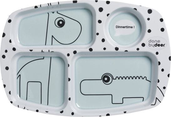 Talerz dzielony Done by Deer rozdziela posiłek na 4 porcje. Talerzyk dziecięcy delikatnie oddziela od siebie pokarmy. Lekki talerz z melaniny umożliwia serwowanie różnych smakołyków z podziałem. Przy początku rozszerzania diety to jest wskazane, gdyż dziecko bada jedzenie, przekłada między przegródkami, doświadcza różnych konsystencji, smaków, barw, może dokonać samodzielnie wyboru co chce spróbować zjeść. Starsze dzieci często nie lubią, gdy jezdnie styka się ze sobą. Mięsko i sosik lepiej gdy leżą osobno od surówki ;) Dodatkowo wyższy rant talerz pozwala dzieciom na samodzielne nabieranie go na sztućce.
