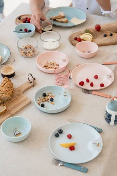 Talerzyk obiadowy dla dzieci Mio od Little Dutch powstał w współpracy z holenderską firmą Mepal, która specjalizuje się w produkcji akcesoriów do żywności. Lekki, wykonany z wyjątkowo mocnego plastiku, wolnego od BPA, który jest mocny, dzięki czemu jest całkowicie bezpieczny dla dzieci. Talerz ma lekko zagięty rant, co ułatw dzieciom nabieranie jedzenia na sztućce, czy też paluszkami. Idealny do praktykowania samodzielności, jedzenia metodą BLW.