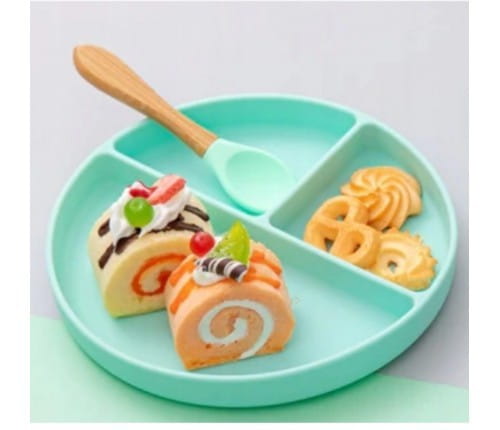 Trójdzielny talerzyki wykonany z bezpiecznego silikonu. Talerzyk wprost idealny przy rozszerzaniu diety dziecka i karmienia metodą blw. Przegródki w talerzyku umożliwiają podanie dziecku w jednym posiłku różnorodnych, wartościowych pokarmów. Przedziałki pozwolą nie łączyć pokarmów i konsystencji, czego małe dzieci często się domagają. Dzieci mogą dokonać wyboru co chciałby zjeść, samodzielnie paluszkami próbować, doświadczać smaków i kolorów. Talerz dziecięcy ma zintegrowane dno z przyssawką, zassie się do blatu stolika, trudno będzie dziecku go zrzucić na ziemię podczas jedzenia.