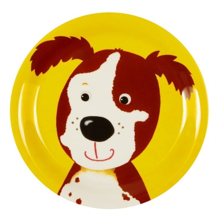 Lekki, kolorowy talerzyk z pieskiem wykonany z melaniny. Talerzyk dziecięcy idealnie sprawdzi się do podawania porcji jedzenia dla dzieci, śniadania, obiadu, podwieczorku, owoców, czy domowego ciasta. Talerzyk dziecięcy z melaminy można myć w zmywarce.