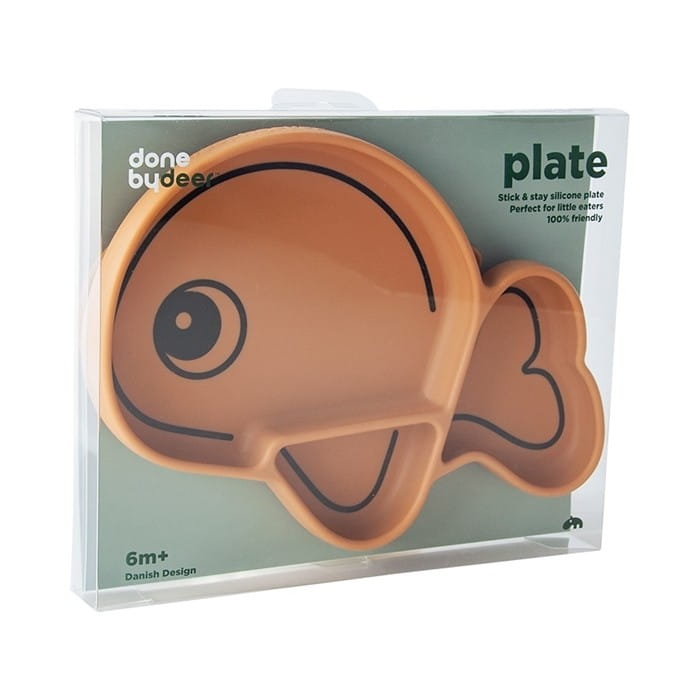 Trójdzielny talerzyki Done by Deer w kształcie rybki, wykonany z bezpiecznego silikonu. Talerzyk wprost idealny przy rozszerzaniu diety dziecka i karmienia metodą blw. Przegródki w talerzyku umożliwiają podanie dziecku w jednym posiłku różnorodnych, wartościowych pokarmów. Przedziałki pozwolą nie łączyć pokarmów i konsystencji, czego małe dzieci często się domagają. Dzieci mogą dokonać wyboru co chciałby zjeść, samodzielnie paluszkami próbować, doświadczać smaków i kolorów. Talerz dziecięcy ma zintegrowane dno z przyssawką, zassie się do blatu stolika, trudno będzie dziecku go zrzucić na ziemię podczas jedzenia.