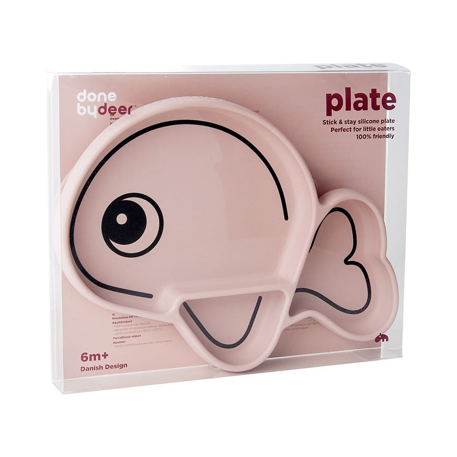 Trójdzielny talerzyki Done by Deer w kształcie rybki, wykonany z bezpiecznego silikonu. Talerzyk wprost idealny przy rozszerzaniu diety dziecka i karmienia metodą blw. Przegródki w talerzyku umożliwiają podanie dziecku w jednym posiłku różnorodnych, wartościowych pokarmów. Przedziałki pozwolą nie łączyć pokarmów i konsystencji, czego małe dzieci często się domagają. Dzieci mogą dokonać wyboru co chciałby zjeść, samodzielnie paluszkami próbować, doświadczać smaków i kolorów. Talerz dziecięcy ma zintegrowane dno z przyssawką, zassie się do blatu stolika, trudno będzie dziecku go zrzucić na ziemię podczas jedzenia.