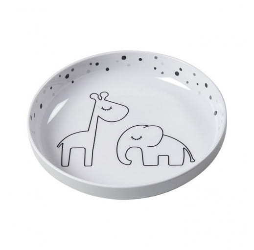 Dziecięcy talerzyk z melaminy Done by Deer z wyższym rantem. Odpowiednia pojemność, zaokrąglone kształty i wyprofilowanie sprawią, że dzieci z przyjemnością zjadają podane dania obiadowe, przekąski, czy warzywa i owoce. Najmłodsi mogą cieszyć się odkrywaniem sympatycznych zwierzaków na dnie tego uroczego talerzyka. Wyższy rant z pewnością ułatwi samodzielne nakładanie pokarmów na sztućce.