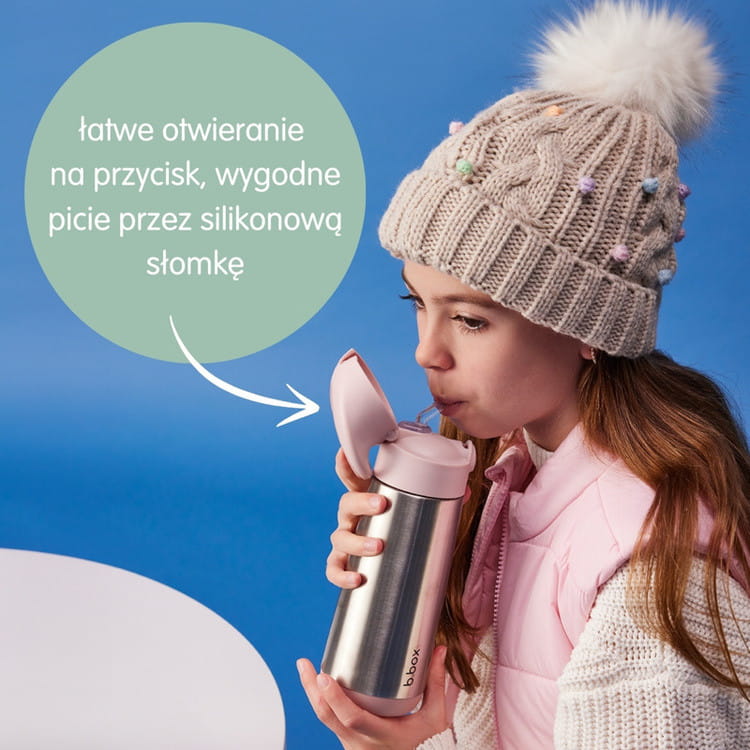 Termiczna butelka b.box - z silikonową słomką, podwójnymi ściankami, szybkim systemem otwierania na przycisk i szczelnym zamknięciem. Dzięki podwójnym ścianką ze stali nierdzewnej utrzymuje napój w pożądaną temperaturę jeszcze dłużej: ciepły do 8 godzin, chłodny do 15 godzin. Bidon nie przecieka, ma zintegrowany uchwyt do przenoszenia i zawieszania. Istnieje możliwość dokupienia wymiennych słomek. Pojemność bidonu 500 ml w sam raz by napoić podczas lekcji, czy wycieczki spragnione dziecko. Termobutelka b.box jest łatwa w czyszczeniu.