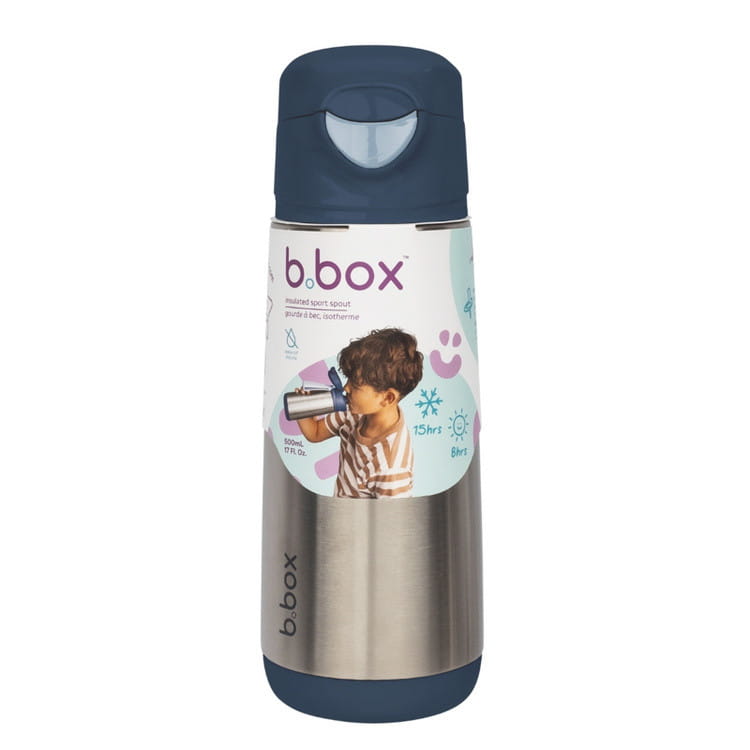 Termiczna butelka b.box - z silikonowym ustnikiem, podwójnymi izolowanymi ściankami, szybkim systemem otwierania na przycisk i szczelnym zamknięciem. Dzięki podwójnym ścianką ze stali nierdzewnej utrzymuje napój w pożądaną temperaturę jeszcze dłużej: ciepły do 8 godzin, schłodzony do 15 godzin. Bidon nie przecieka, ma silikonowy uchwyt do łatwego przenoszenia i zawieszania. Pojemność bidonu 500 ml w sam raz by nawonić w szkole, na treningu, czy podczas wycieczki spragnione lub zmarznięte dziecko. Termobutelka b.box jest łatwa w czyszczeniu, a silikonowy ustnik można wymienić na nowy (do kupienia w naszym sklepie), gdy się zużyje.