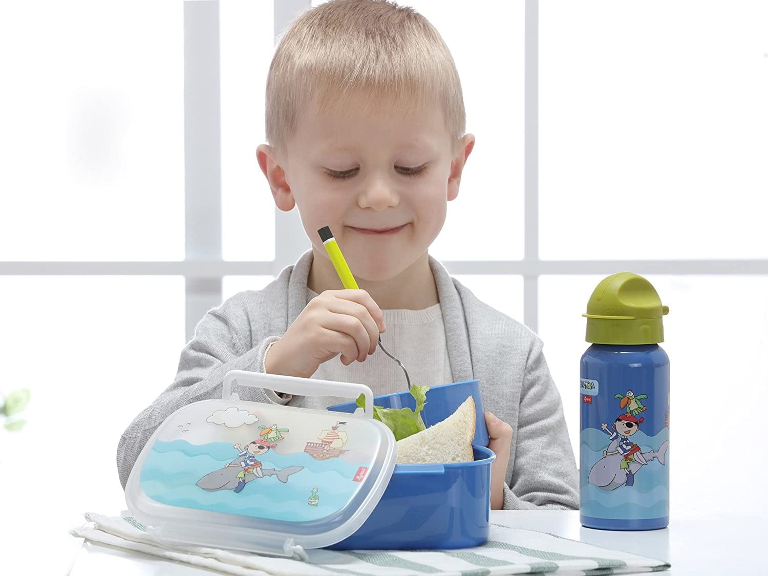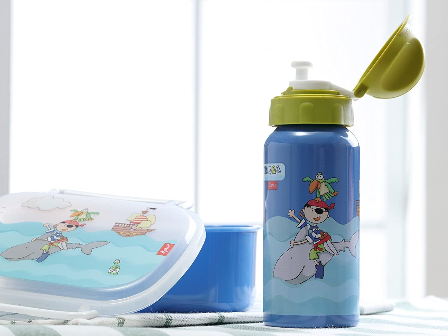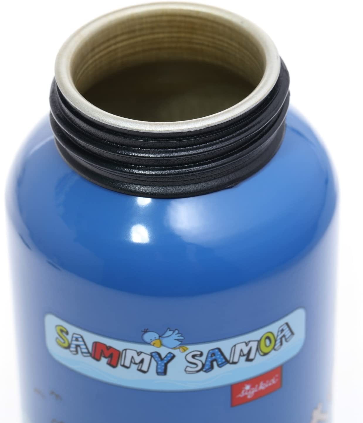 Bidon dziecięcy Sigikid Pirat Sammy Samoa znakomicie sprawdzi się do szkoły lub do przedszkola, na wycieczki i w podróży. Bidon aluminiowy jest bezpieczny dla dzieci, lekki, poręczny, łatwo się otwiera i zamyka poprzez przekręcenie nakrętki. Dziecko nie musi dotykać ustnika aby otwierać i zamykać, przekręca nakrętkę, co gwarantuje lepszą higienę ustnika. Butelka do picia w kolorze niebieskim z piratem i rekinem posiada zielony ustnik.
