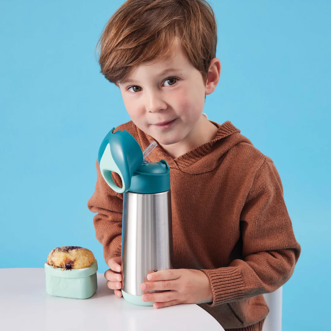 Termiczna butelka b.box - z silikonową słomką, podwójnymi ściankami, szybkim systemem otwierania na przycisk i szczelnym zamknięciem. Dzięki podwójnym ścianką ze stali nierdzewnej utrzymuje napój w pożądaną temperaturę jeszcze dłużej: ciepły do 8 godzin, chłodny do 15 godzin. Bidon nie przecieka, ma zintegrowany uchwyt do przenoszenia i zawieszania. Istnieje możliwość dokupienia wymiennych słomek. Pojemność bidonu 500 ml w sam raz by napoić podczas lekcji, czy wycieczki spragnione dziecko. Termobutelka b.box jest łatwa w czyszczeniu.