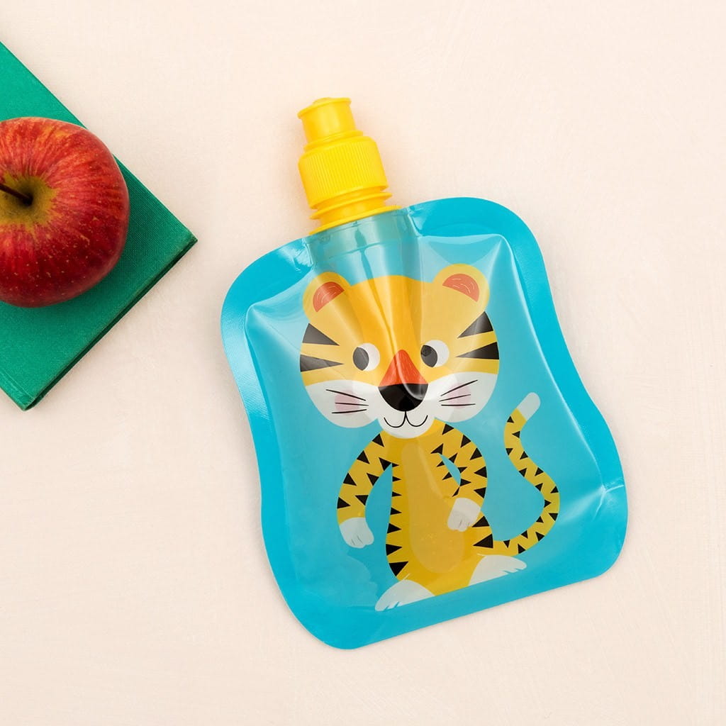 Zwijany bidon na wodę marki Rex London, seria z tygrysem Tiger. Składana butelka to idealne naczynie do zabrania na wycieczkę, plac zabaw, spacer. Po wypiciu i zawinięciu powstaje mały rulonik. Dzięki temu nie obciąża i nie zajmuje zbędnego miejsca w plecaku dziecka.