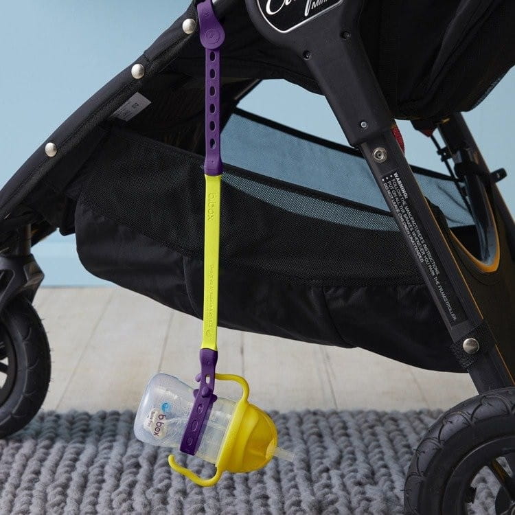Gumowa linka, regulowany pasek do bidonu B.box chroni przed upadkiem, zgubieniem się kubka, pobrudzeniem ustnika, czy zniszczeniem butelki. Smycz B.box można przypiąć do wózka podczas spaceru, krzesełka w trakcie karmienia, fotelika samochodowego lub torby. Dzieci lubią zrzucać różne przedmioty z wysokości, obserwują i uczą się. Teraz mogą to czynić w bezpieczny sposób oraz same próbować wciągnąć z powrotem ulubiony bidon.