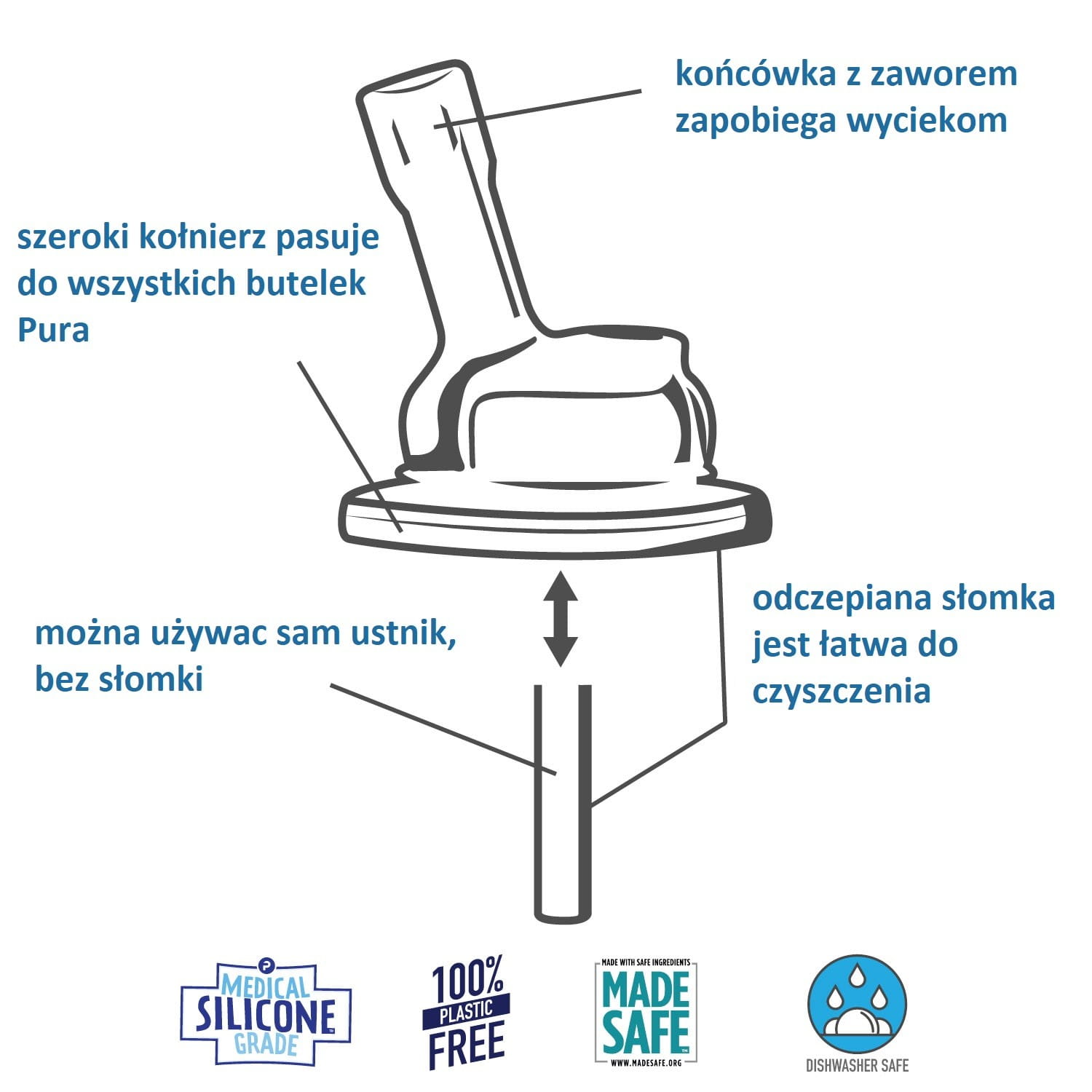 Pierwszy na rynku system słomek z czystego silikonu. Słomka PURA wykonana jest w 100% z silikonu klasy medycznej. Słomka składa się z dwóch części, co umożliwia picie z butelki na dwa sposoby: Używając obu części, można ssać przez słomkę w zwykły sposób (butelka w pozycji pionowej). Po zdjęciu dolnej części słomki można pić z butelki w taki sam sposób, jak za pomocą ustnika (butelka odwrócona do góry nogami). W obu przypadkach dzięki membranie w górnej części słomki, ciecz nie spływa i nie ma ryzyka rozlania.