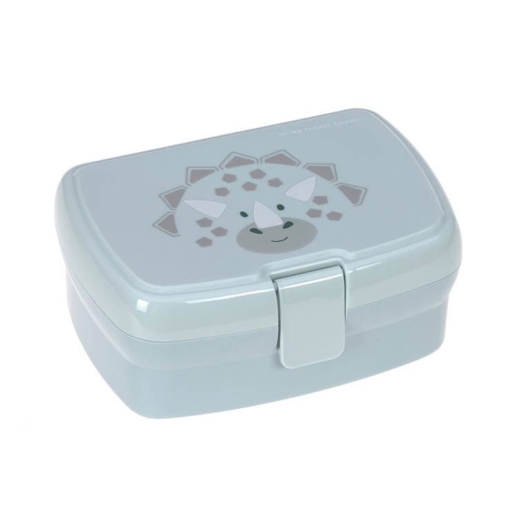 Jasnoturkusowy lunchbox ma bladoniebieską pokrywkę z grafiką dinozaura. Ta sama mordka znajduje się także na bidonie.