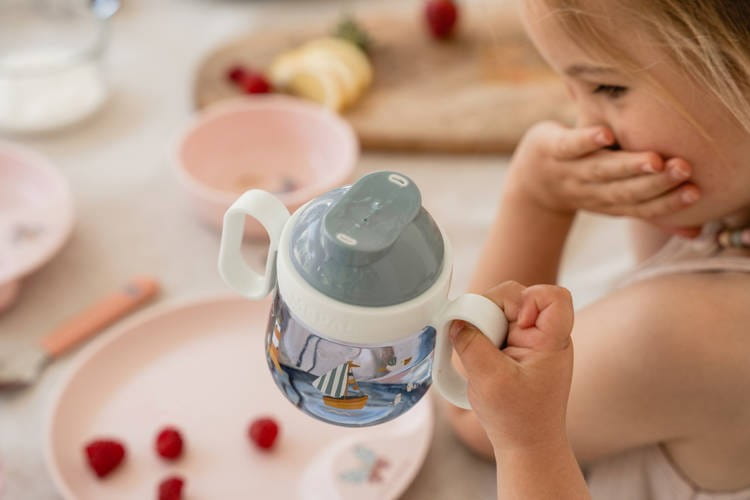 Kubek niekapek Mio od Little Dutch z kolekcji Sailors Bay powstał w współpracy z holenderską firmą Mepal, która specjalizuje się w produkcji akcesoriów do żywności.