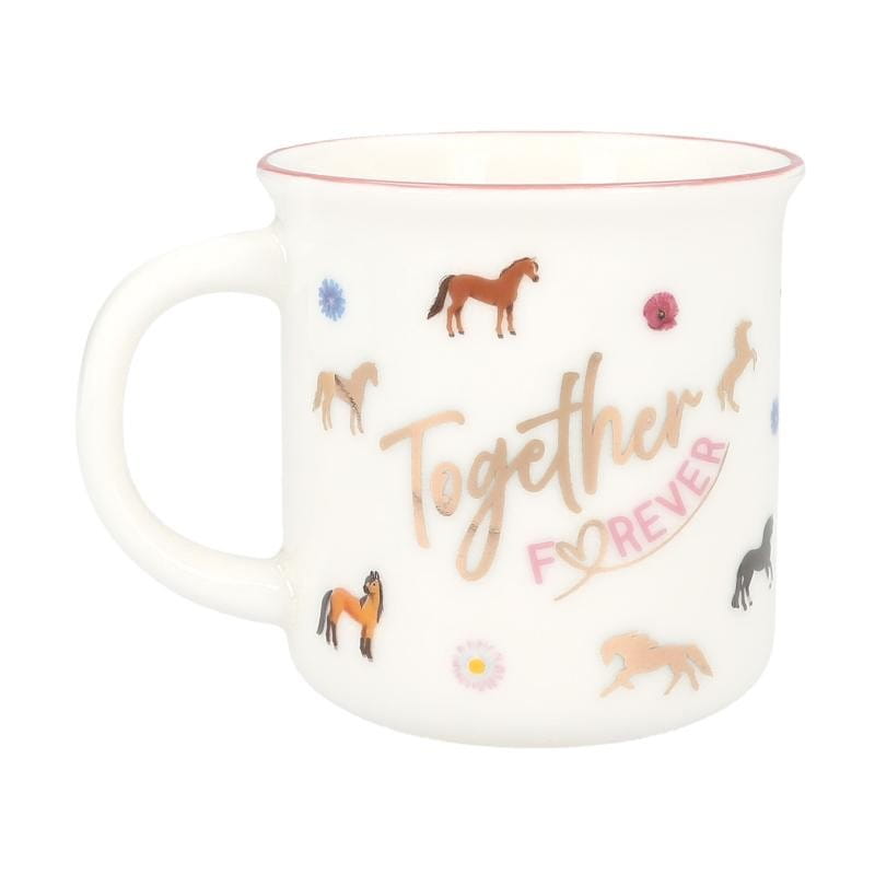 Porcelanowy kubek z uchwytem oraz wizerunkiem koni, uroczymi kwiatami, różowym brzegiem. Idealny kubek do picia ciepłego kakao, czy herbaty na dobry dzień i poprawę nastroju.