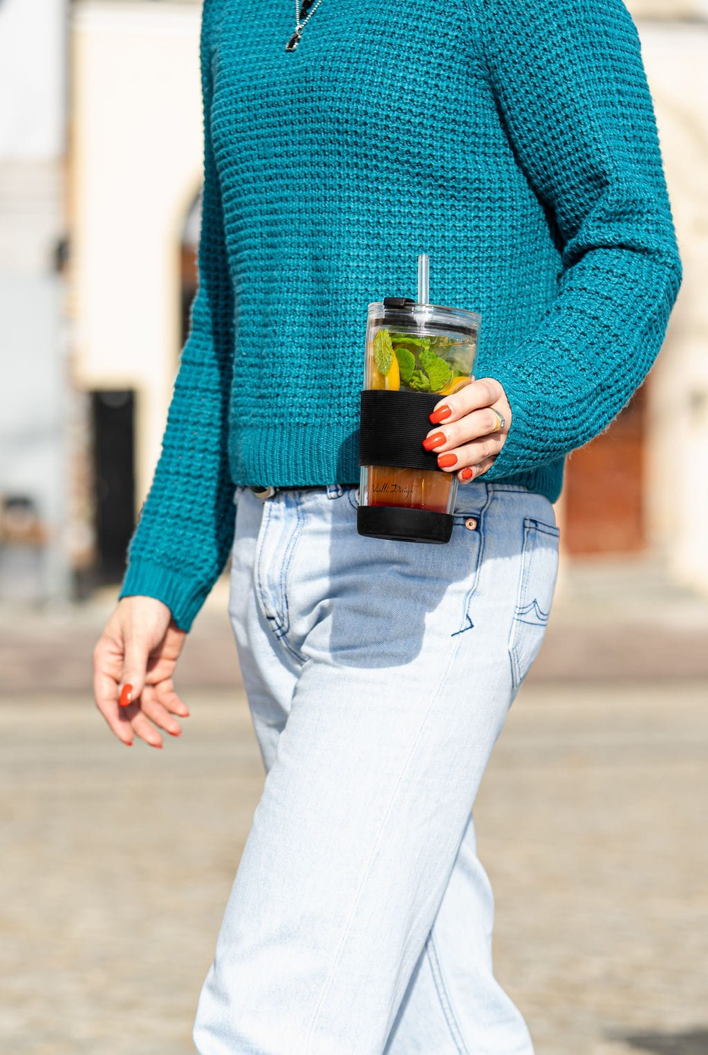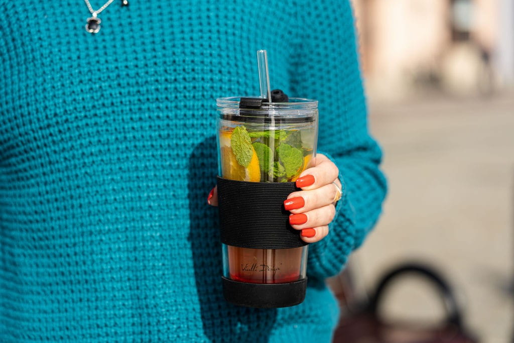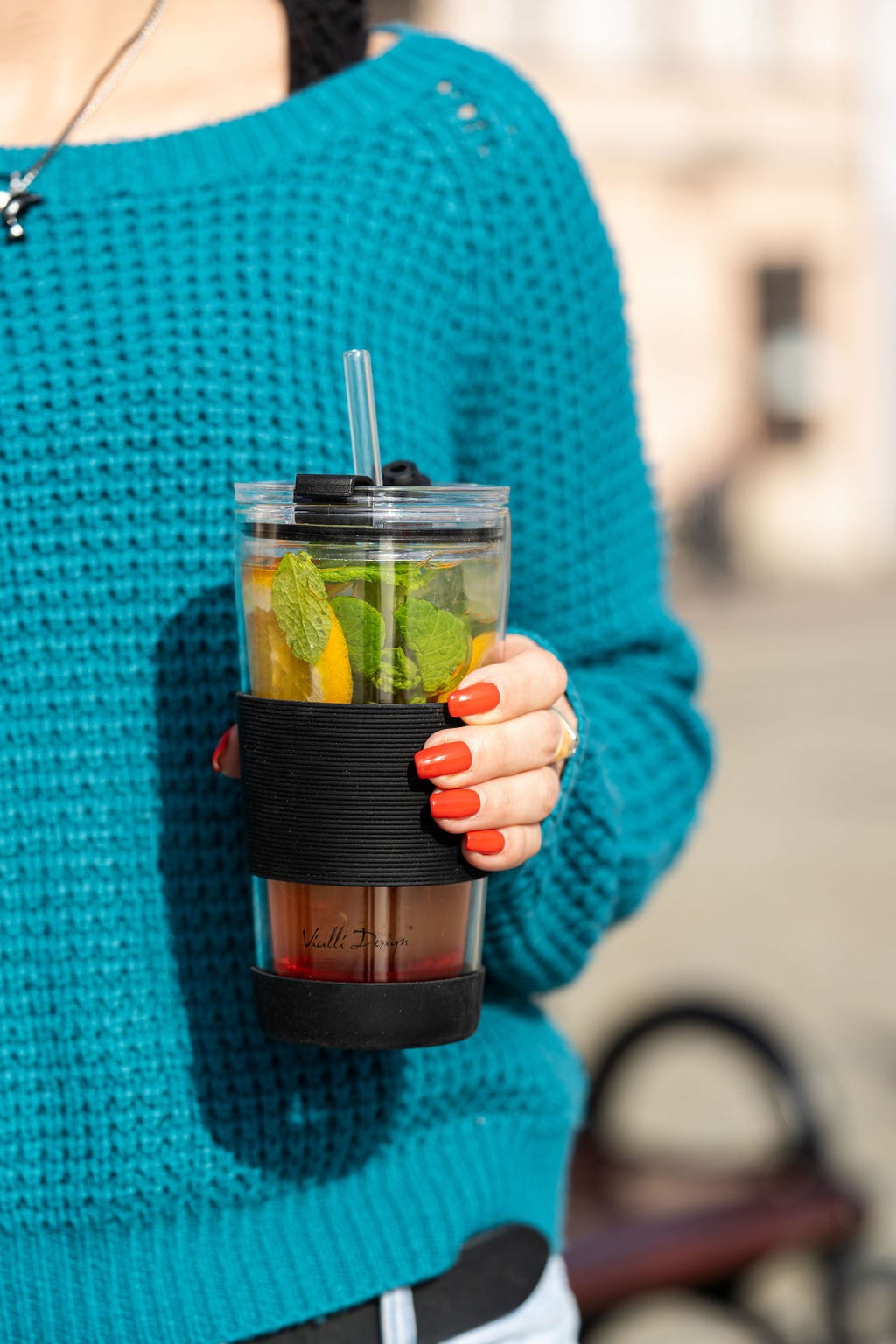 Kubek posiada dwufunkcyjne zamykanie, w zależności od preferencji użytkownika można używać centralnego otworu oraz słomki lub pić bezpośrednio z kubka za pomocą drugiego otworu. Szklana słomka zakończona silikonową końcówką sprawia, że picie jest wyjątkowo wygodne.