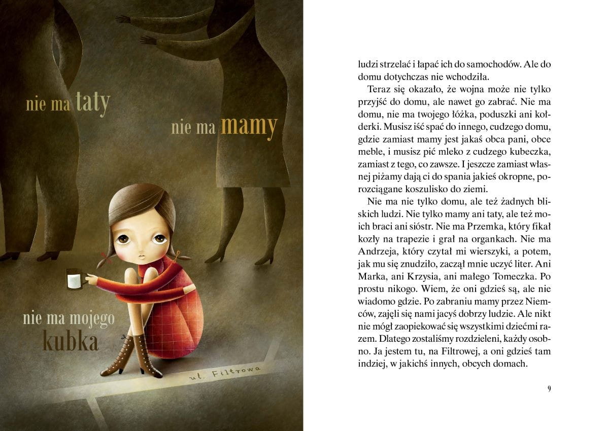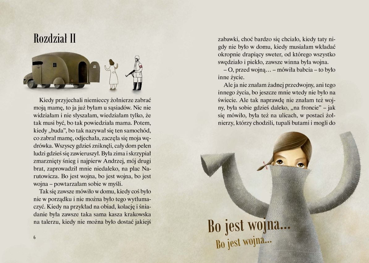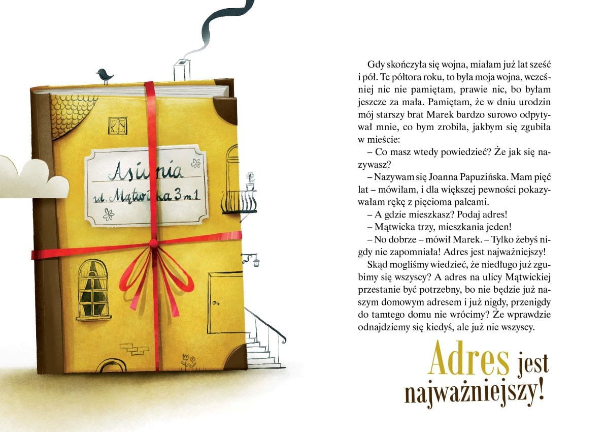Historia małej Asiuni, dla której wojna zaczęła się tuż po jej piątych urodzinach, gdy pewnej nocy znikła mama i cały dom. Trzeba było iść spać do cudzego domu, gdzie zamiast mamy była obca pani, obce meble i trzeba było pić mleko z cudzego kubeczka, zamiast z tego co zawsze. Asiunia bardzo uważnie obserwuje świat i stara się jak najwięcej zrozumieć, choć przecież dla tak małej dziewczynki jest to strasznie trudne.