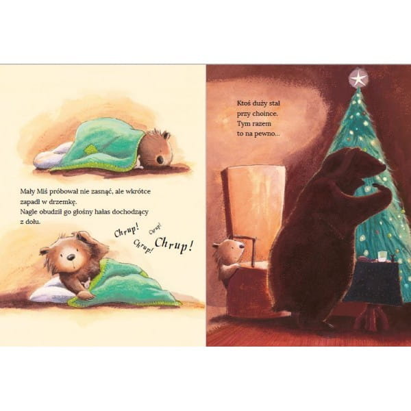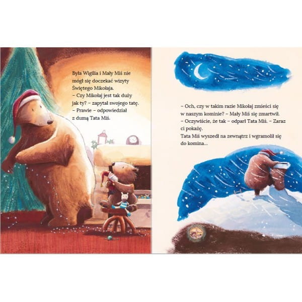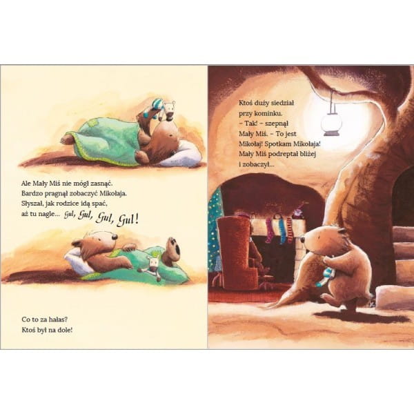 Była Wigilia i Mały Miś nie mógł się doczekać wizyty Świętego Mikołaja. „Mikołaj pojawi się zaraz po tym, jak pójdziesz spać” – powiedziała Mama Miś, ale jej synek nie miał ochoty iść do łóżka. Chciał zobaczyć Mikołaja. Nagle usłyszał jakieś bulgotanie… Co to za hałas? Ktoś jest na dole! Czy to naprawdę św. Mikołaj?