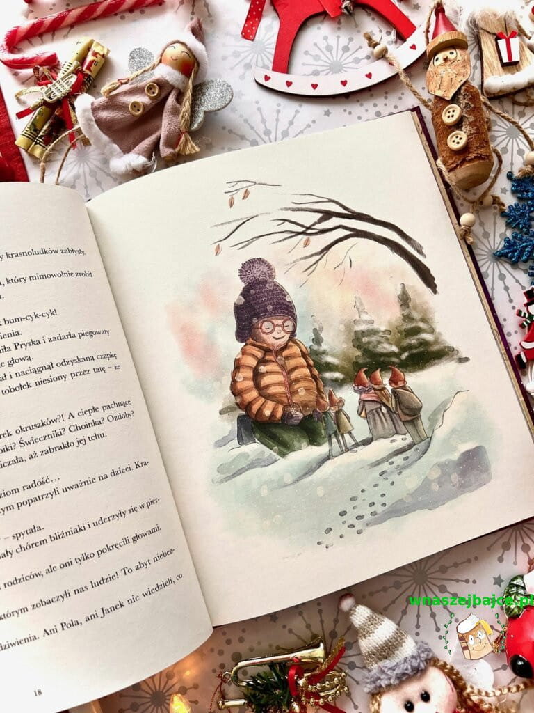 Jest Wigilia. Choć do wieczora jeszcze sporo czasu i w domu ferwor przygotowań, Pola i Janek już wypatrują pierwszej gwiazdki. Aż tu nagle… Co to? Przy choince kręcą się dwa krasnoludki…?! To Pryska i Tytus. Okazuje się, że razem z rodziną właśnie zamieszkali w opuszczonej mysiej norce, po tym jak stracili poprzedni dom i wszystko, co posiadali. Dzieci bardzo chcą pomóc krasnoludkom, by też miały piękne święta. Niestety Złota księga krasnoludków mówi jasno, że gdy zostanie się zobaczonym przez ludzi, trzeba się szybko wynosić. Chyba że otrzyma się zaproszenie od najstarszego członka rodziny, o co jednak nie wolno prosić… Czy Poli i Jankowi uda się zorganizować pomoc, nie zdradzając obecności nowych małych przyjaciół? Na szczęście mogą liczyć na dyskretne wsparcie babci, która zdaje się wiedzieć więcej, niż jest gotowa przyznać… Świąteczna bajka, utrzymana w tonie klasycznych opowieści, która rozgrzewa serce jak kubek gorącego kakao. W sam raz do rodzinnego czytania – nie tylko od święta.