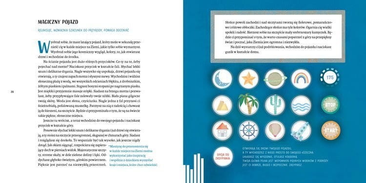 Autorka Martyna Broda proponuje elementy medytacji, pozytywnych afirmacji, wizualizacji i pracy z oddechem, wprowadza małych i dużych czytelników w bajkowy, bezpieczny i błogi świat niczym nieskrępowanej wyobraźni.