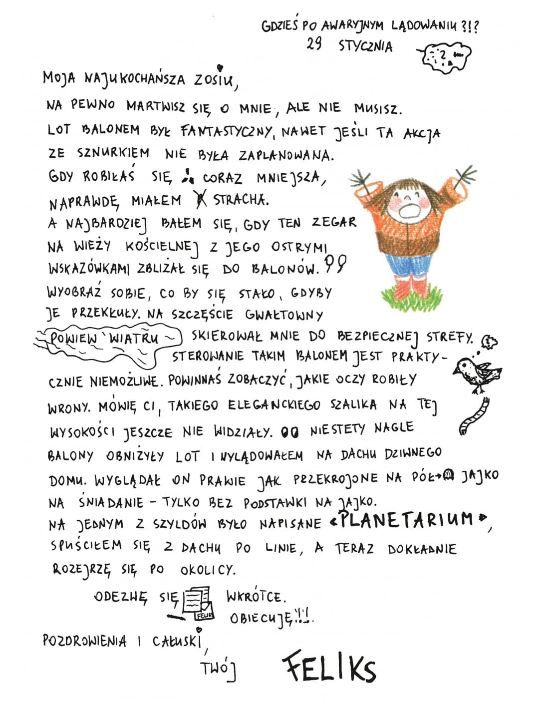 Bez tajnego planu Zosi i Feliksa to wszystko by się nie wydarzyło! Pluszowy zając, żądny przyrodniczych przygód, szybuje skonstruowanym przez Zosię balonem. Tym samym rozpoczyna się niesamowita podróż wokół błękitnej planety. Kilka dni póżniej przychodzi pierwszy list... Pojawia się coraz więcej listów, które pluszowy zając przesyła z Księżyca, Arktyki, Karaibów, lasów tropikalnych i kontynentu australijskiego. Jego opisy są pełne humoru i zawierają wiele ciekawostek o środowisku naturalnym i otaczającym nas świecie. Listy są umieszczone w sześciu prawdziwych kopertach.
