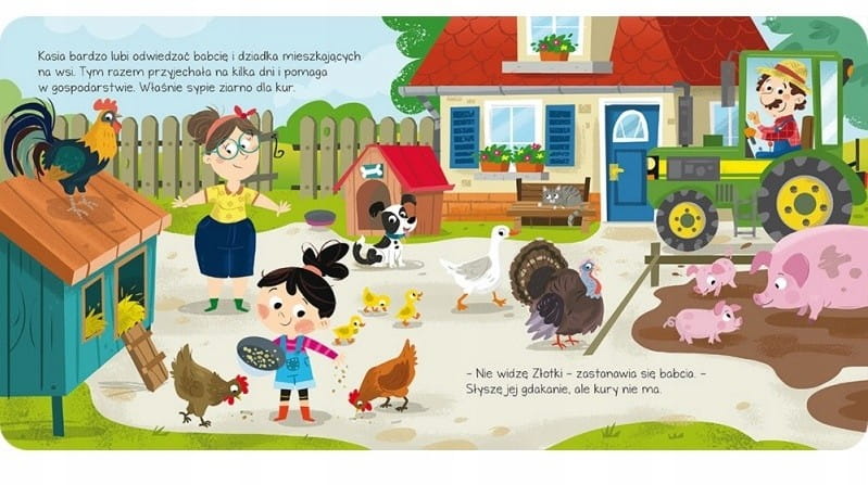 Wyprawa na wieś inna niż zwykle – z podwórka zniknęła kura Złotka. Poszukamy jej razem Wytężamy słuch, zaglądamy do różnych kryjówek i podążamy za odgłosem „ko, ko, ko”.