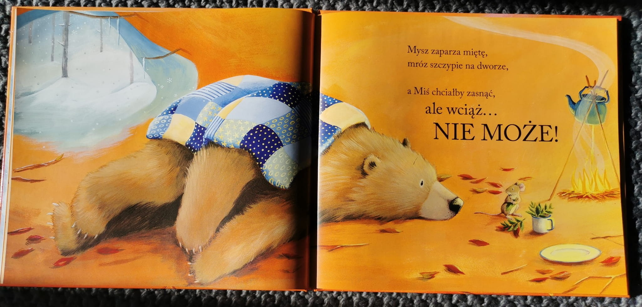 Nadszedł czas zimowego snu niedźwiedzi. Pan Miś nie może usnąć, choć wierci się i próbuje. Z pomocą przychodzą mu przyjaciele: Mysz, Borsuk, Kret, Kruk, Zając, Suseł, Strzyżyk i Sowa. Czy miętowa herbatka i kołysanki śpiewane przez zwierzaki utulą Misia do snu?