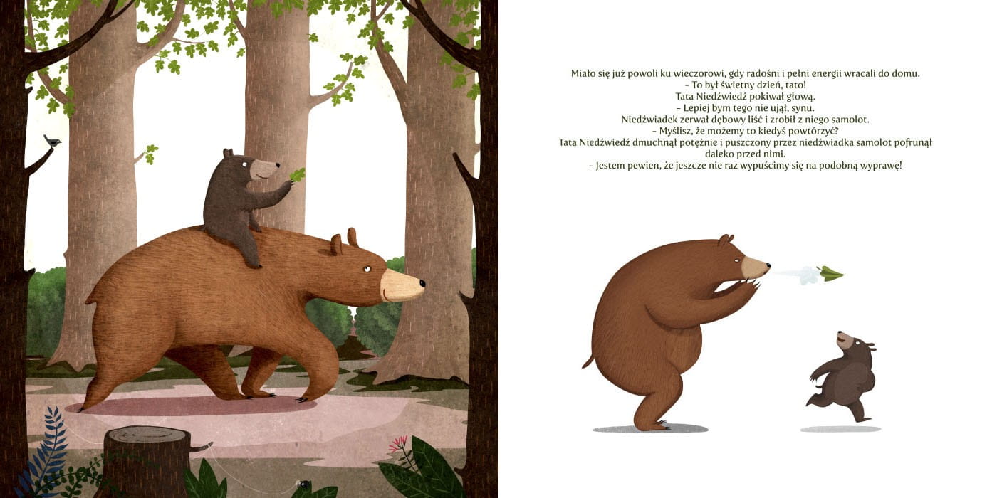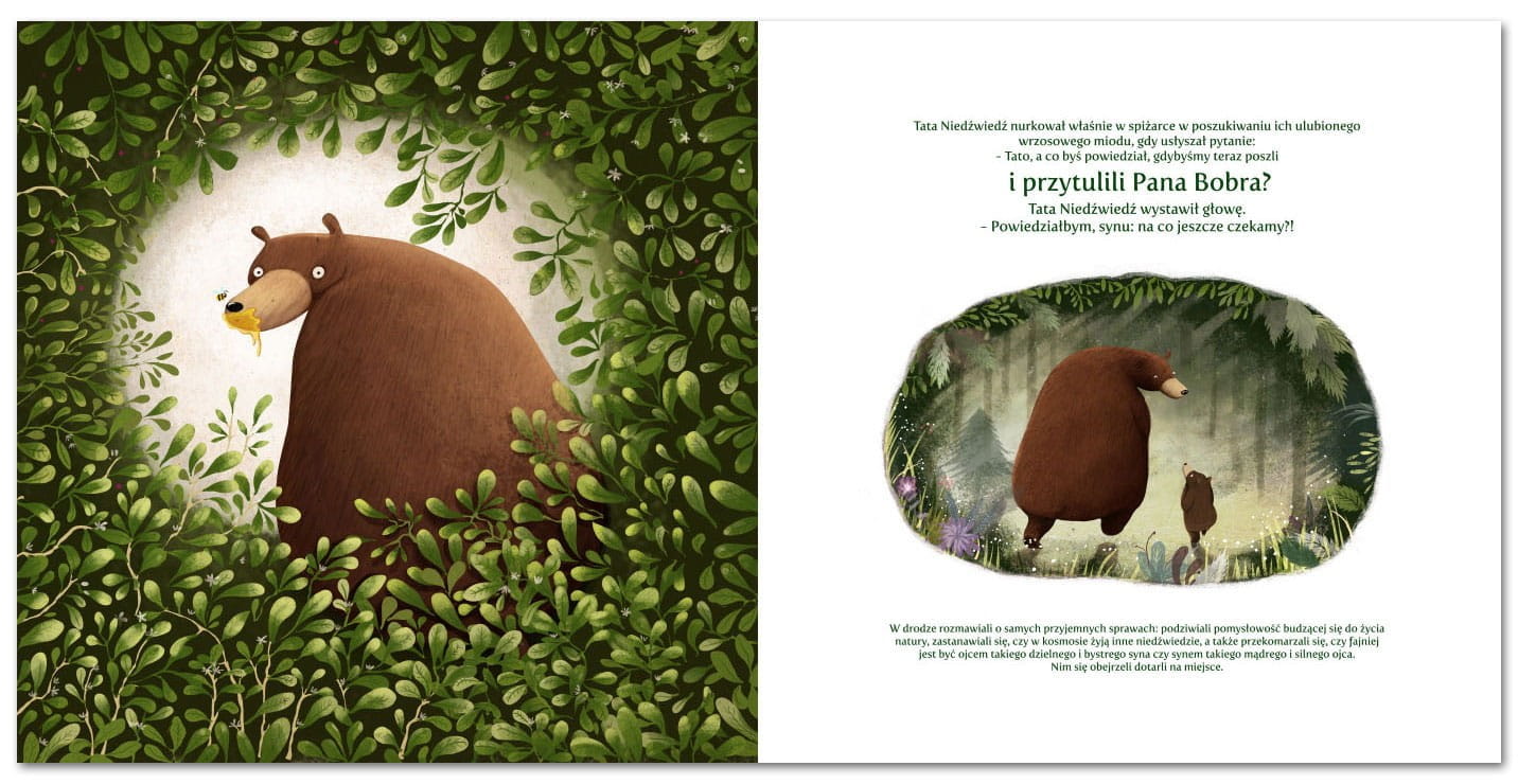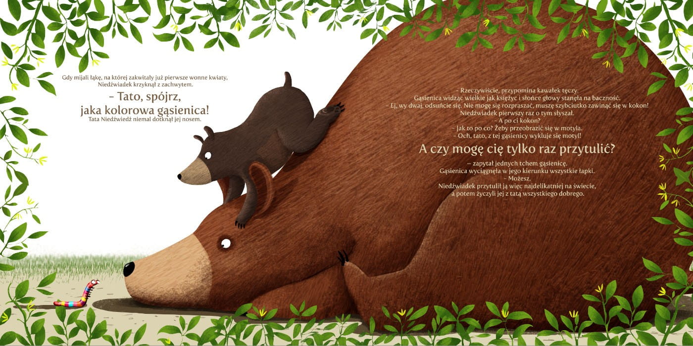 Czy wiecie, jaki jest najlepszy sposób na udany dzień? Pewnego dnia Tata Niedźwiedź zdradził w sekrecie Niedźwiadkowi, że wystarczy się mocno do kogoś przytulić, a świat stanie się piękniejszy. I tak zaczęła się niezwykła przygoda ojca i syna. Wędrują razem przez las i przytulają każdego, kogo spotkają na swojej drodze – malutką Gąsienicę, wielką Anakondę, strachliwą łasicę, a nawet Myśliwego ze strzelbą w dłoni…