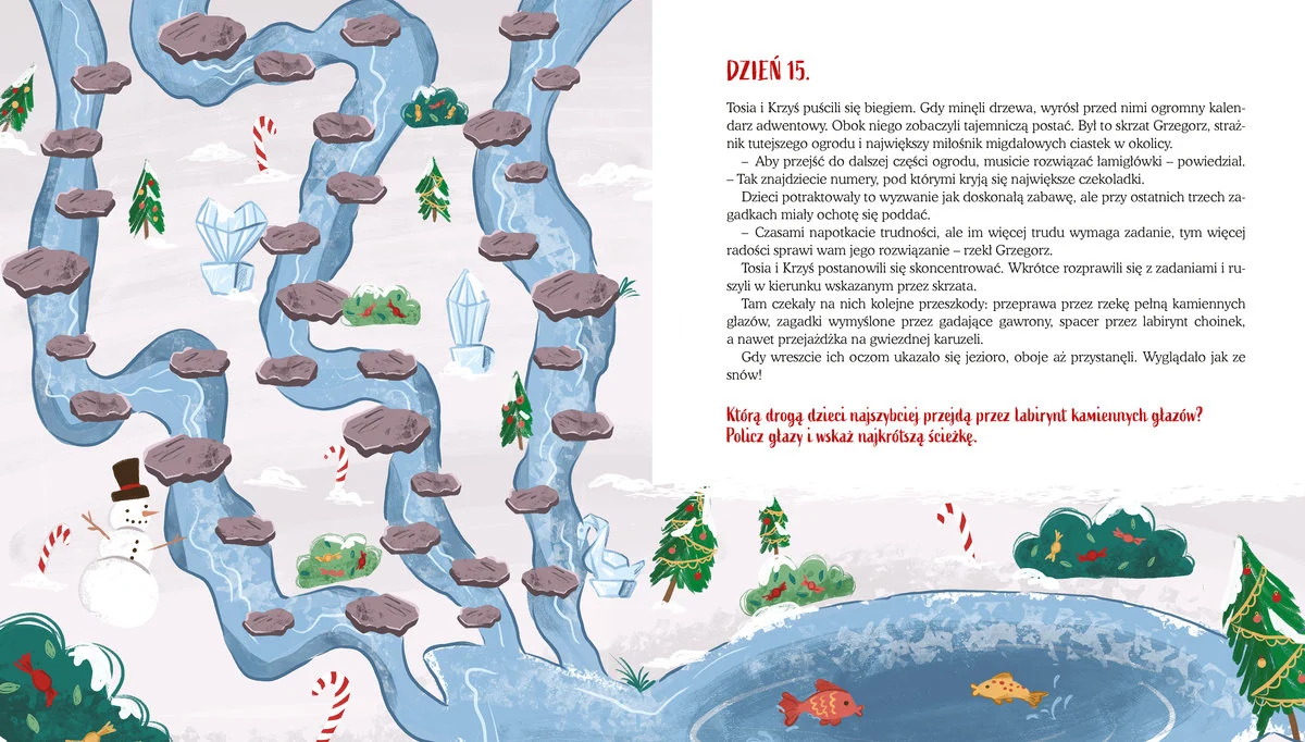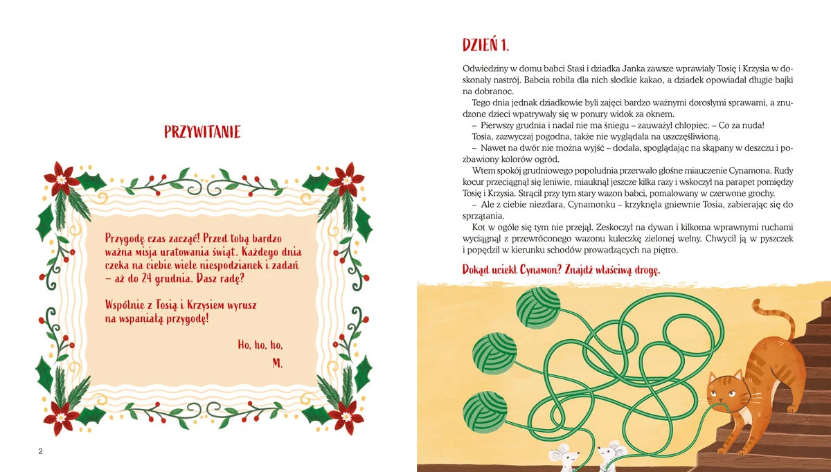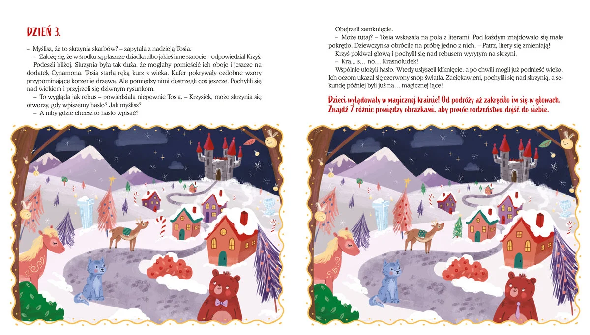 Dołącz do Tosi i Krzysia i przeżyj niezwykłe przygody w Magicznym Lesie. Sprawdzaj stronę po stronie i uważnie czytaj zadania. Czekają na ciebie 24 zagadki – rozwiąż je wszystkie i uratuj Boże Narodzenie!