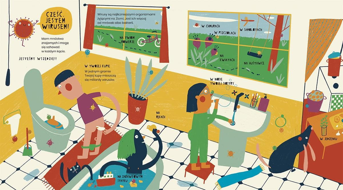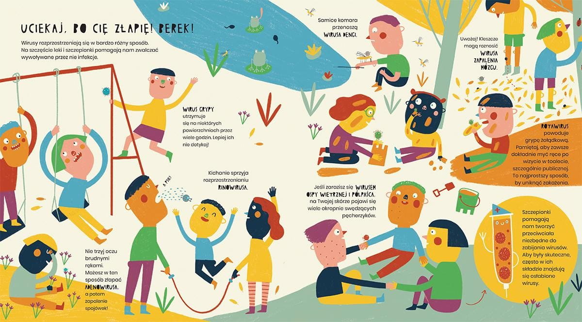 Książka z interesującą grafiką obrazuje czym jest pandemia, co to wirus grypy, rotawirus, wirus ospy, wirus ebola, wirus wścieklizny oraz wiele innych występujących na świecie wirusów.