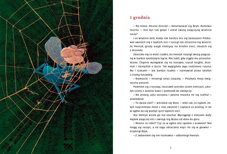 1 grudnia w pajęczą sieć zaplątuje się mucha. Pająk chce zjeść ją na święta i początkowo nawet nie zamierza się do niej odzywać, bo „z jedzeniem się przecież nie rozmawia!”, ale każdego dnia mucha coraz skuteczniej przekonuje pająka, by ją uwolnił. I tak przez 24 rozdziały, aż do Wigilii, wspólnie przeżywają najróżniejsze zabawne przygody – na przykład pająk zamawia… pizzę. Zamówienie dostarcza… biedronka, którą pająk również chce pożreć, ale mucha grozi, że jeśli pająk to zrobi, ona przestanie jeść i do Wigilii będzie bardzo chuda, więc nie będzie z niej pysznej tłustej świątecznej pieczeni. W Wigilię pająk uwalnia również muchę, bo stwierdza, że spędził z nią najpiękniejszy adwent w życiu i że przyjaciół się nie zjada.